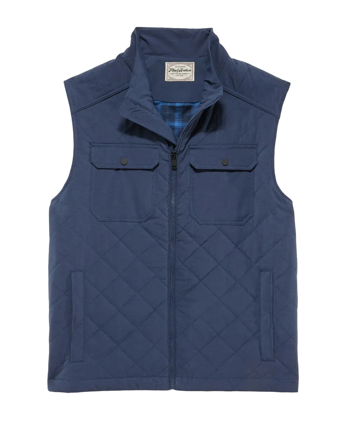 Our iconic quilted jacket that sold out almost instantly last year is now available as a vest. By combining your favorite characteristics of a button-down shirt with a diamond-quilted exterior that offers ample protection from the elements plus a flannel-lined interior for added comfort and warmth, we’ve created the perfect layering piece for when the seasons shift. Dual front flap pockets + angled slit pockets allow you to keep your essentials close and secure. Classic stand-collar; hidden zip-front and snap-button placket.