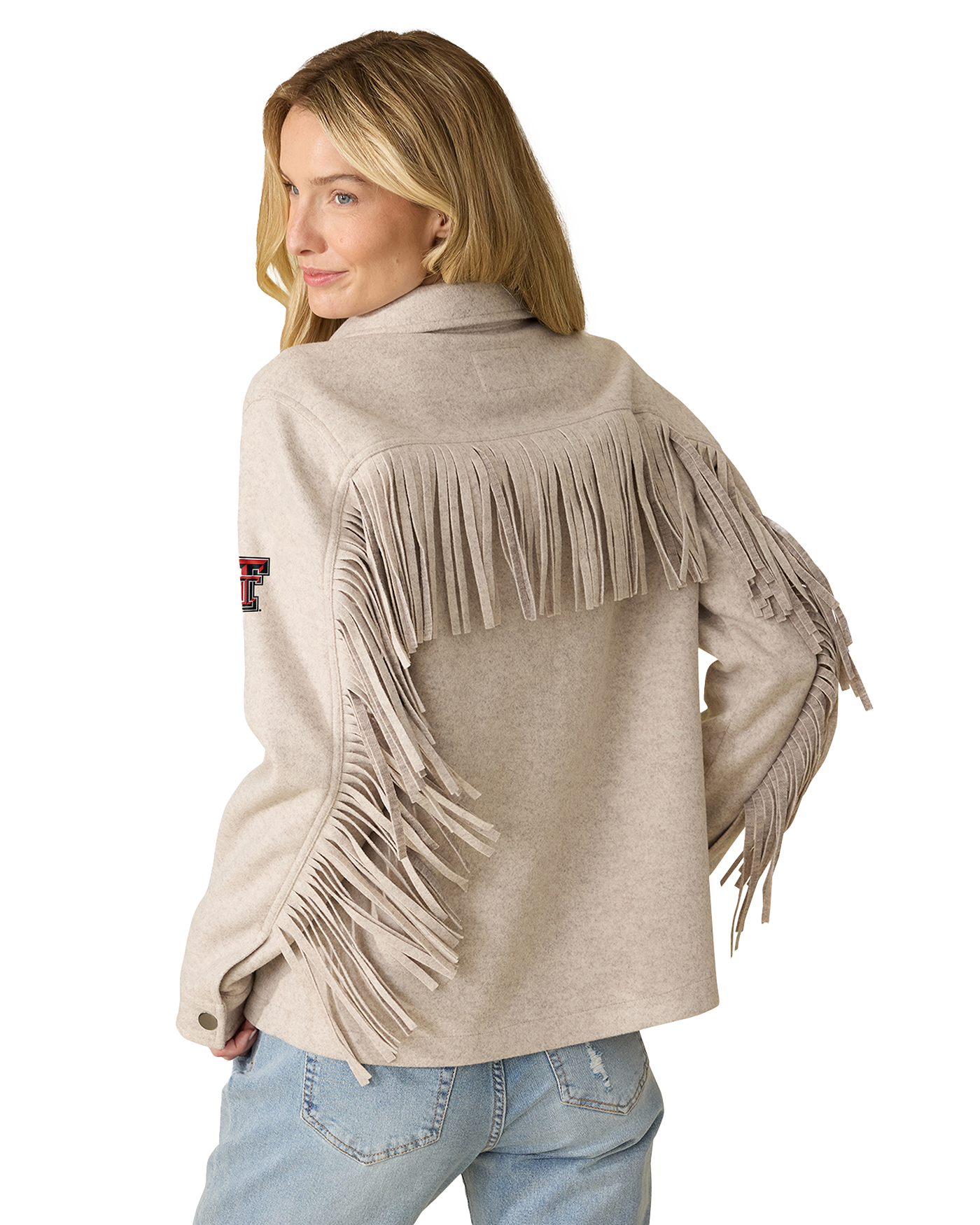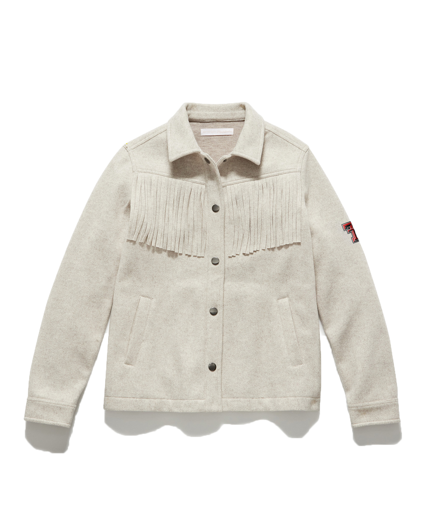 Ultra-soft and subtly textured woven fabric, decorated with fringe detail, shapes this classic shacket that features a collared neckline, drop shoulders, and long sleeves. Functional welt hand pockets accent the relaxed silhouette which secures with a full snap placket. Texas Tech Double T embroidered on sleeve.