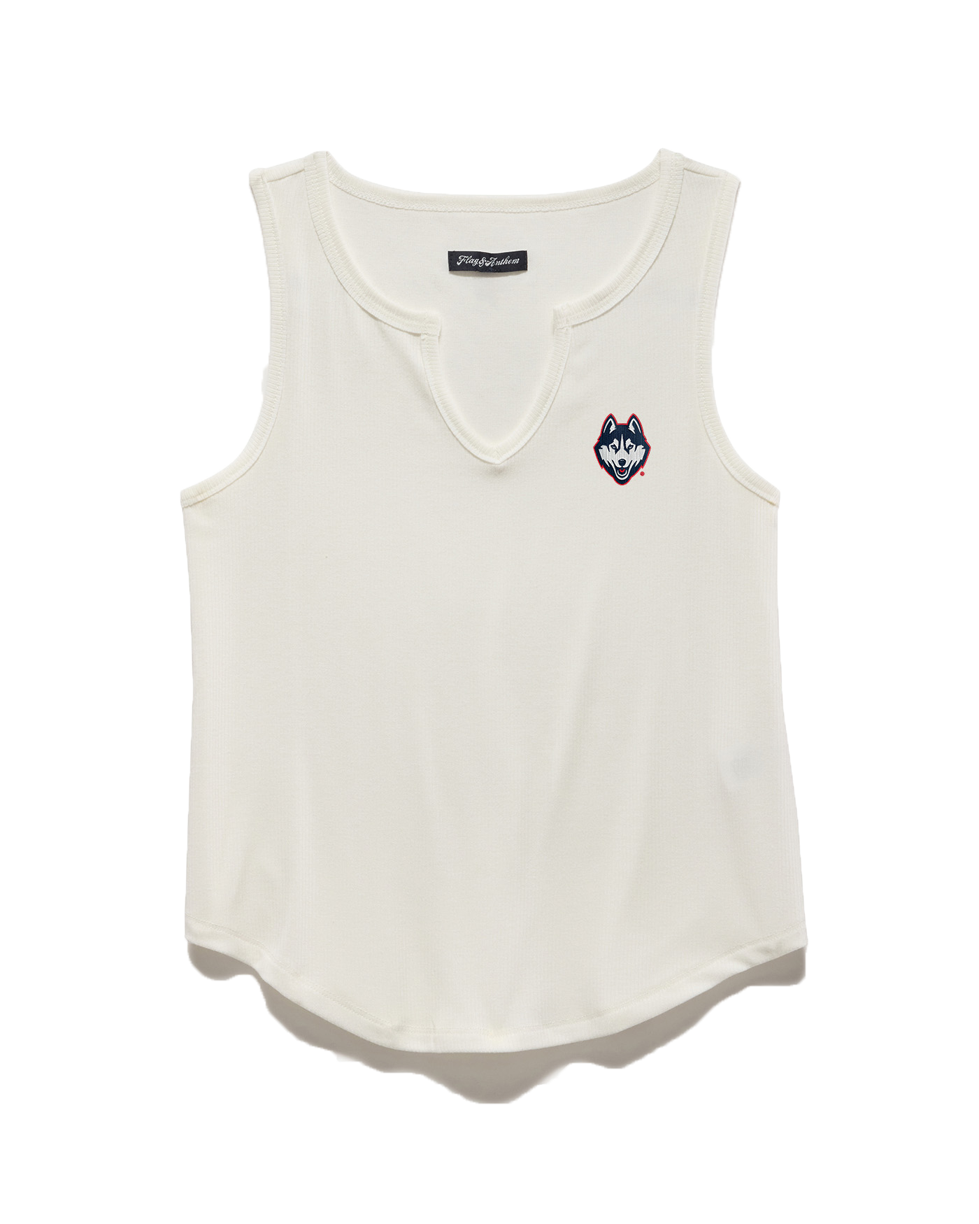 Comfy, casual, classic. Our Anna Tank is a must-have for creating a variety of cute warm-weather looks. Soft and stretchy ribbed knit shapes this essential top that features wide tank straps that frame a notch front neckline– adding a flirty twist on a classic style. UConn Husky Dog embroidered on chest.