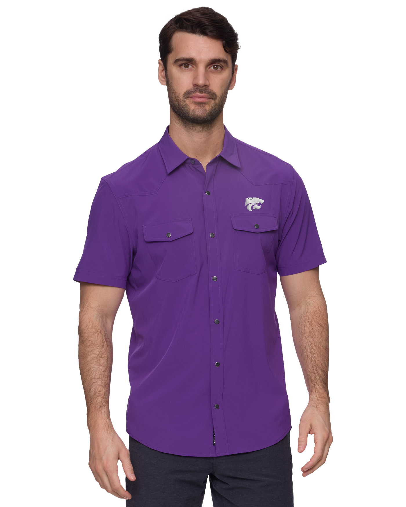 Made from a lightweight and breathable stretch fabric that wicks moisture, dries fast, and provides permanent UPF protection, this elevated short-sleeved Western shirt works hard to keep you comfortable and cool - even on the hottest days. Contrast fabric inside collar stand, back yoke, front placket, and sleeve cuffs. Dual front flap pockets; pearlized snap closures. Hidden lens cleaner at the hem keeps optics clean. Kansas State Wildcats embroidery on chest.