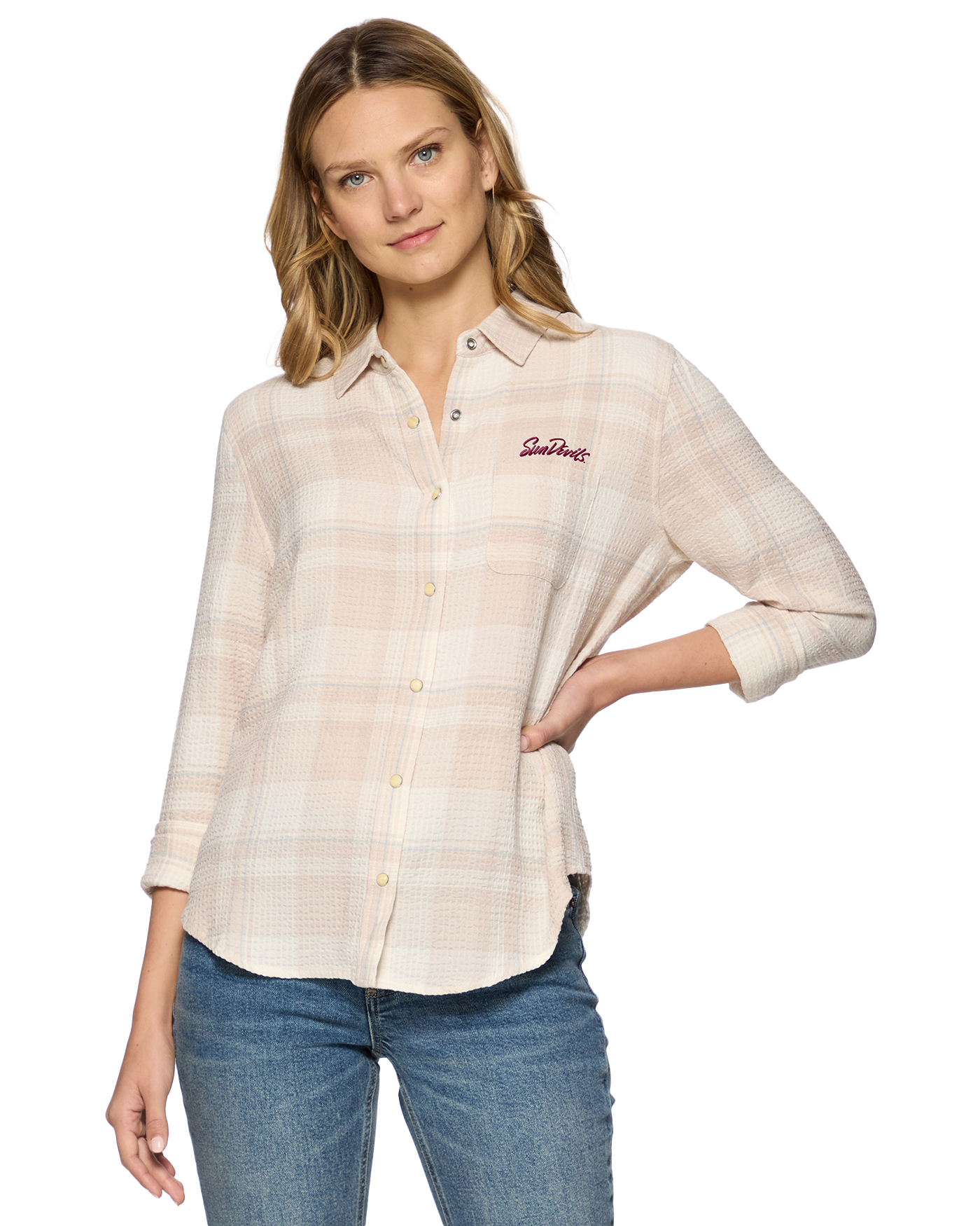 Ultrasoft woven fabric with a hint of stretch; this year-round gameday closet staple features a collared neckline framed by long sleeves with pearl snap cuffs. The relaxed body features a full pearl snap front placket and falls to a slightly rounded hem. Arizona State University Sun Devils embroidered on chest.