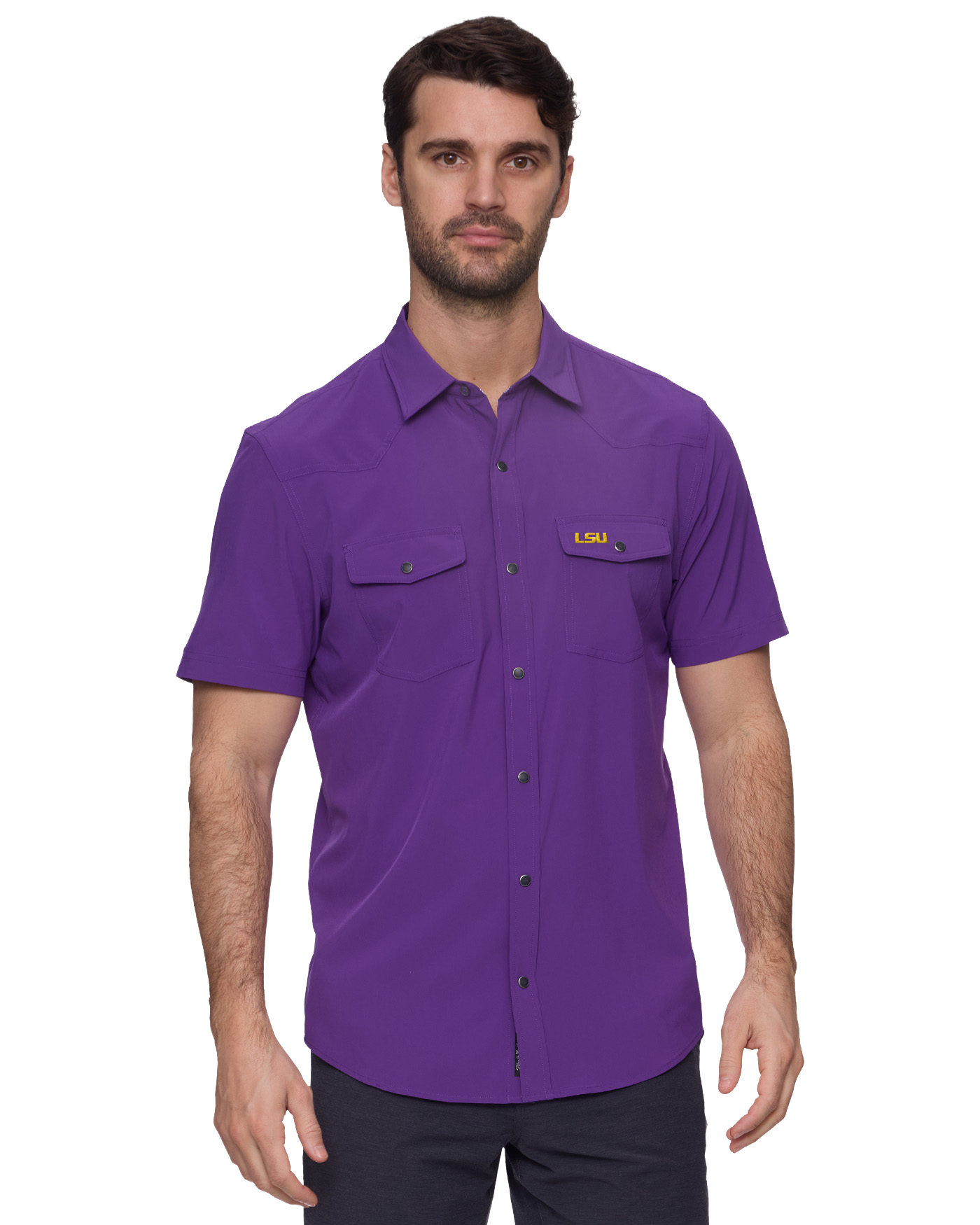 Made from a lightweight and breathable stretch fabric that wicks moisture, dries fast, and provides permanent UPF protection, this elevated short-sleeved Western shirt works hard to keep you comfortable and cool - even on the hottest days. Contrast fabric inside collar stand, back yoke, front placket, and sleeve cuffs. Dual front flap pockets; pearlized snap closures. Hidden lens cleaner at the hem keeps optics clean. LSU block letters embroidered on chest pocket flap.