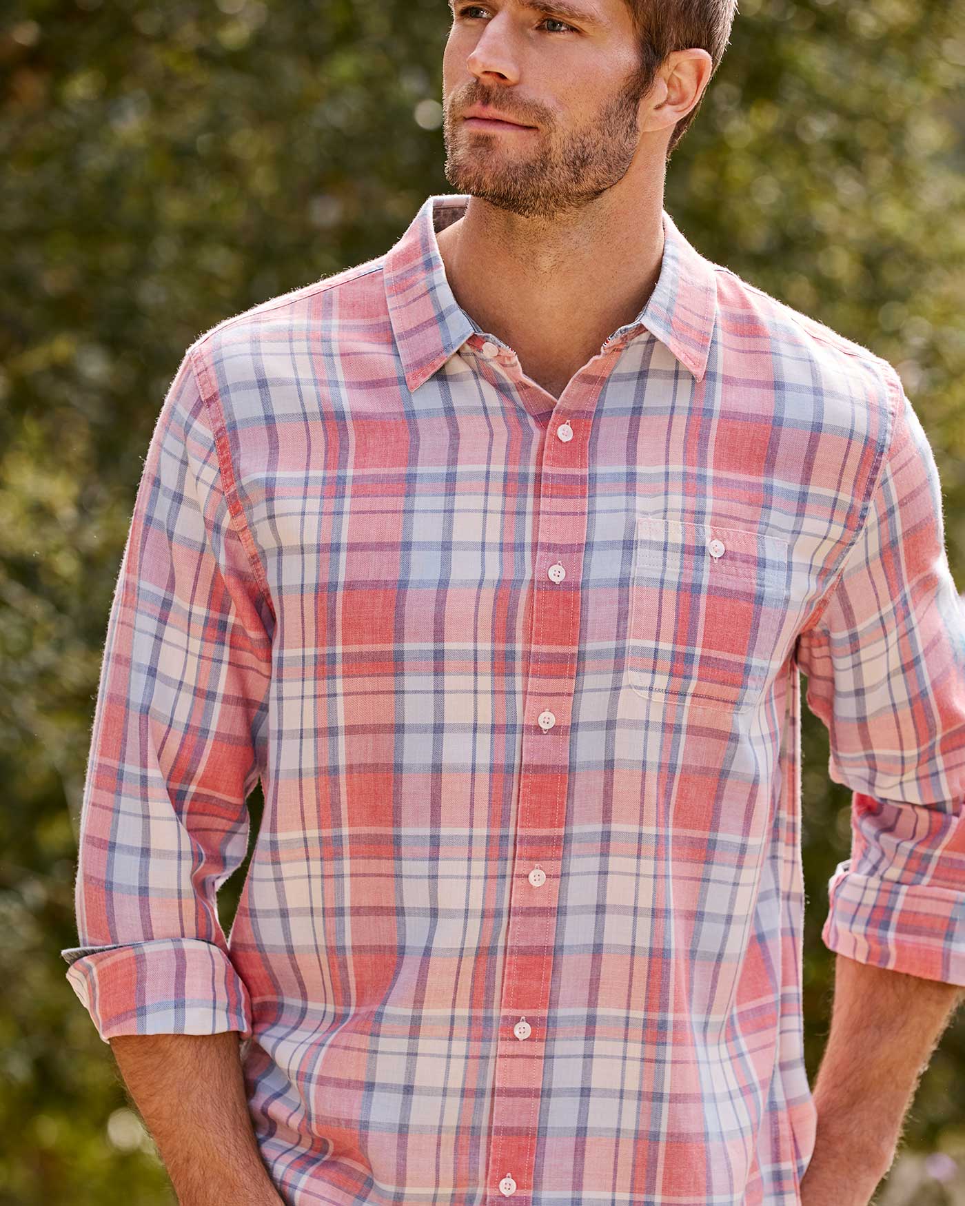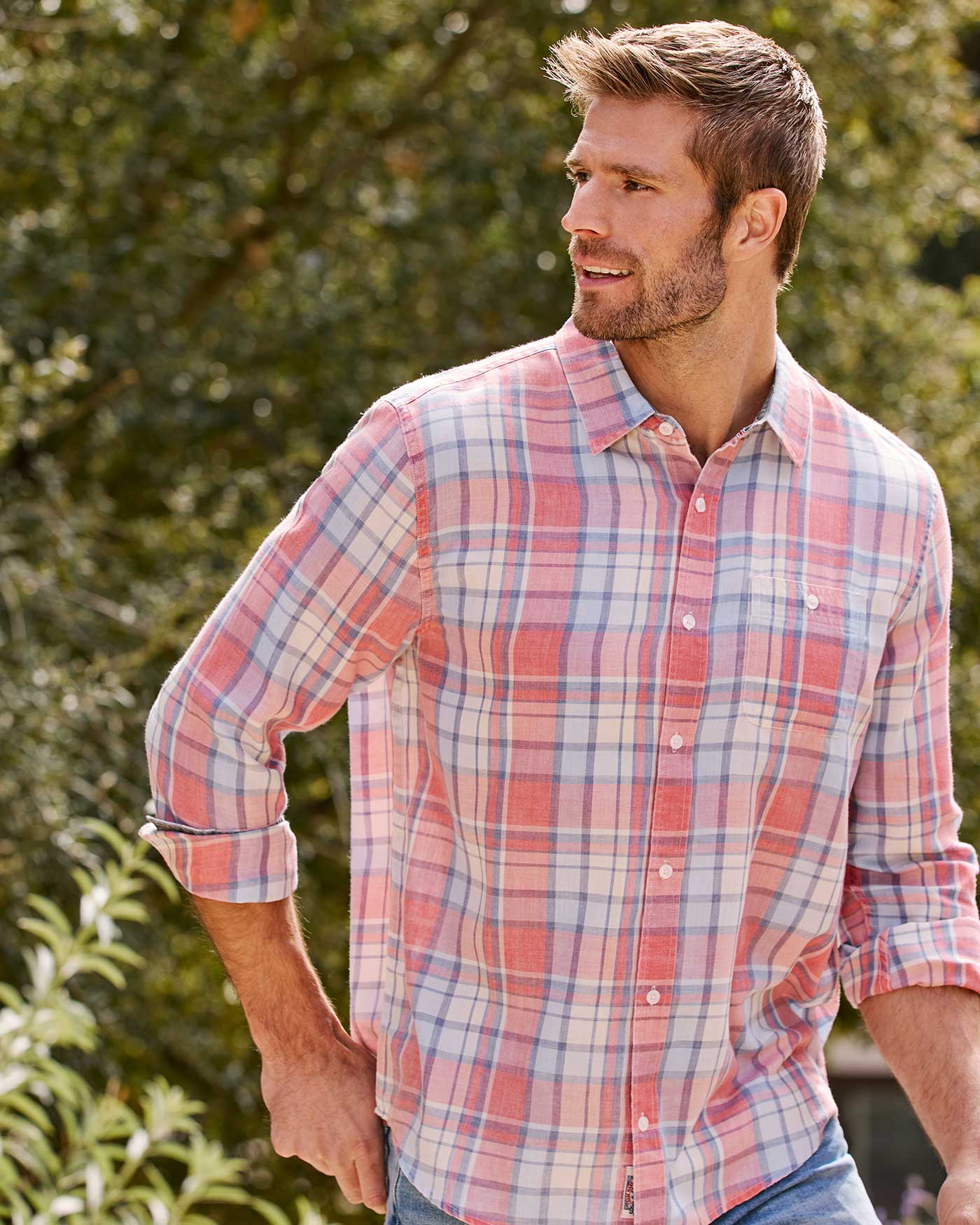 This lightweight button down will follow you through the seasons and with its burnout fabric features, it’ll become softer with every wash. Contrast fabric inside collar stand, back yoke, front placket, and sleeve cuffs. Single front patch pocket; button closures.