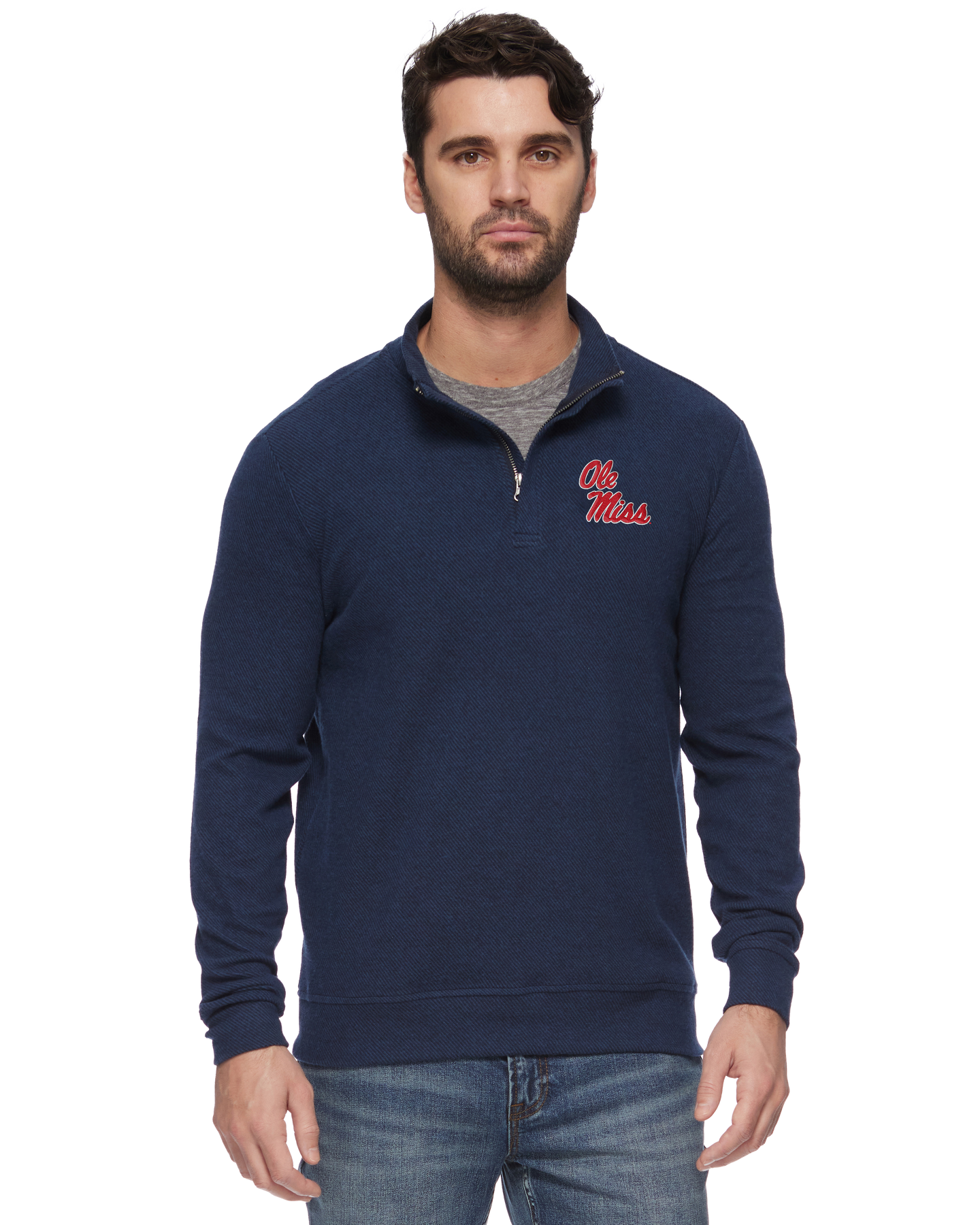 Crafted from a warm, mid-weight cotton blend fabric with a hint of stretch for easy movement and a naturally soft and breathable feel, this timeless pullover features an elevated heathered twill pattern for the perfect blend of rugged and refined. Standing mock neck collar; 1/4-length front zipper from chest to chin. Tailored athletic fit. Ole Miss script lettering embroidered on chest.