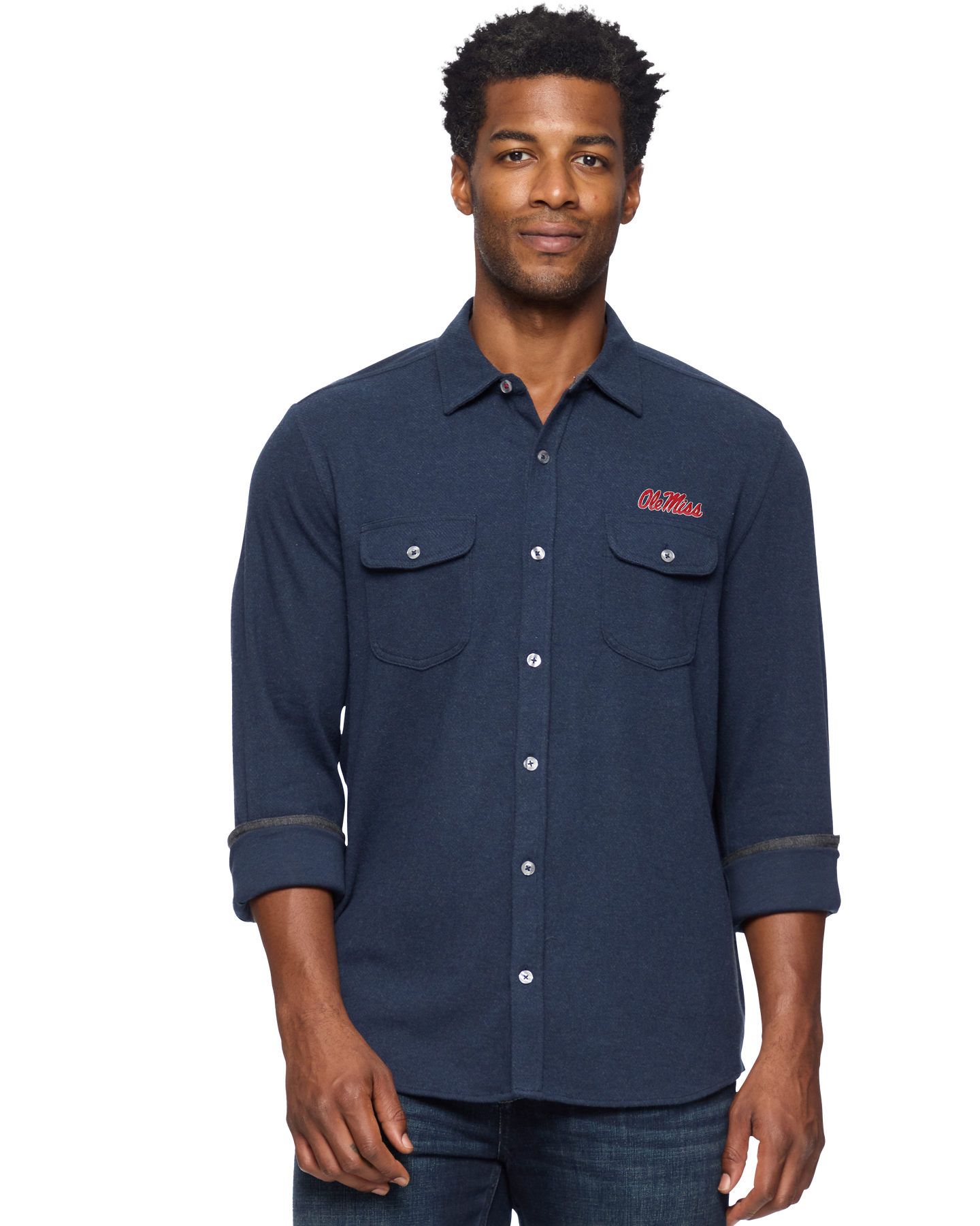 With a blend of extremely soft and stretchy knit performance fabric, you’ll find yourself reaching for this fall favorite all season long. Layer over your favorite tees, or on its own– this endlessly versatile flannel can be worn anytime, anywhere. Contrast fabric inside collar stand, back yoke, front placket, and sleeve cuffs. Dual front chest pockets; button closures. Tailored athletic fit. Ole Miss script lettering embroidered on chest.