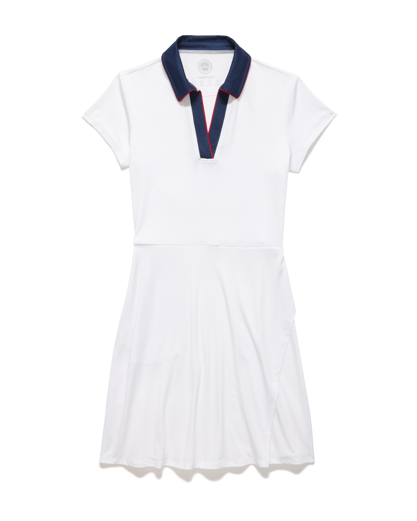 Crafted from our signature stretch fabric that features some of our most innovative performance tech, this performance mini dress offers the most in movement and comfort from the course to the court to coffee. With a short sleeve top that features a v-neckline accented by a crisp collar, a figure hugging body, and a skirt that features a flattering slit and ends in a mini hem; this dress was specifically designed to look good and feel even better.