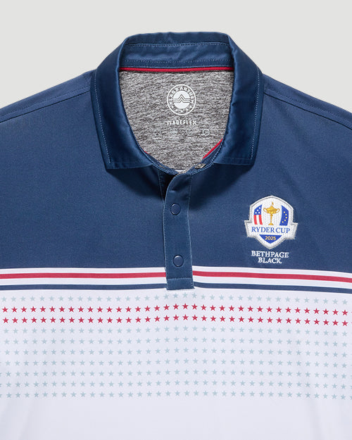 Official 2025 Ryder Cup logo embroidered on left chest.