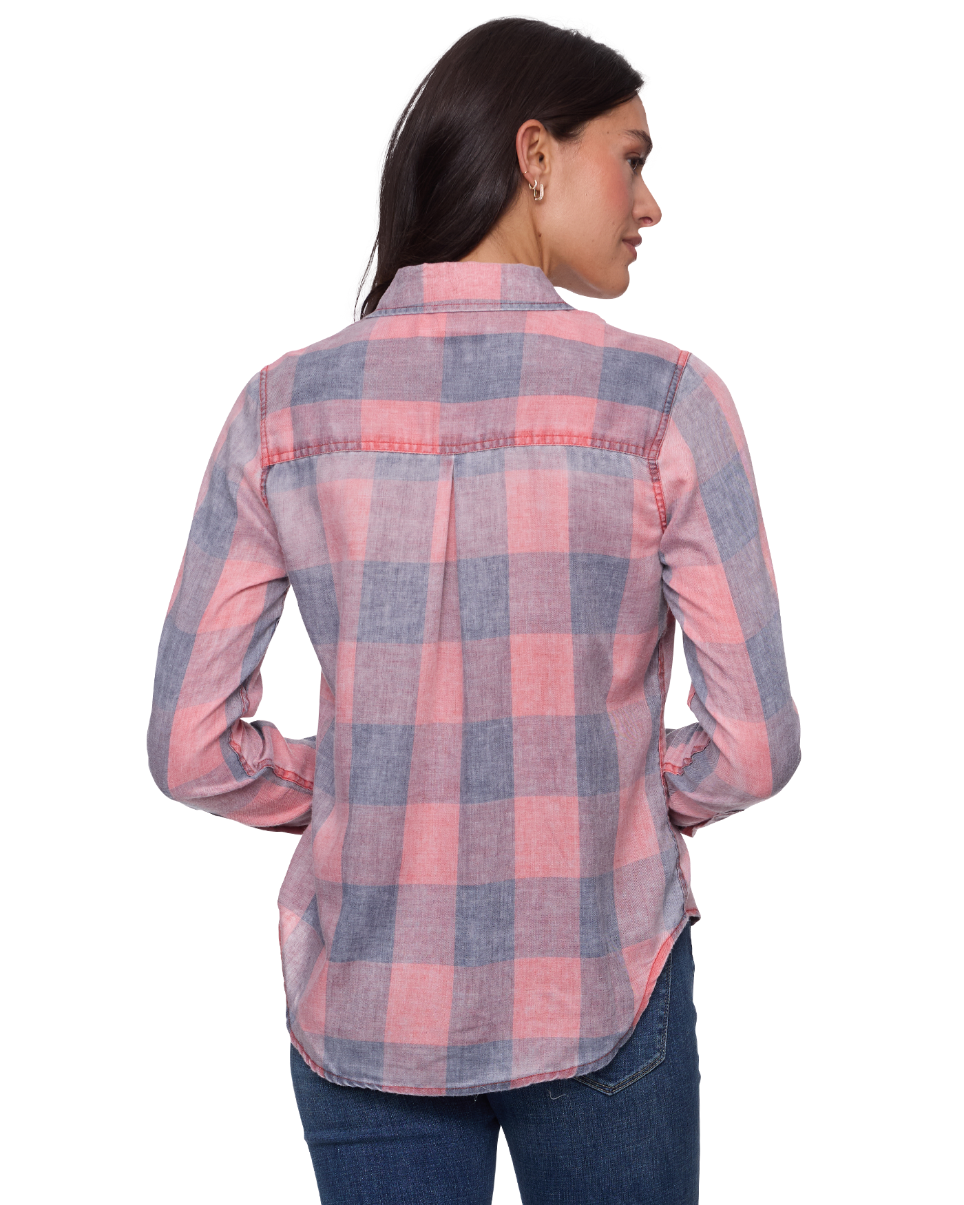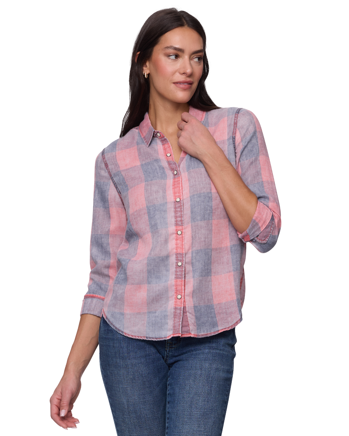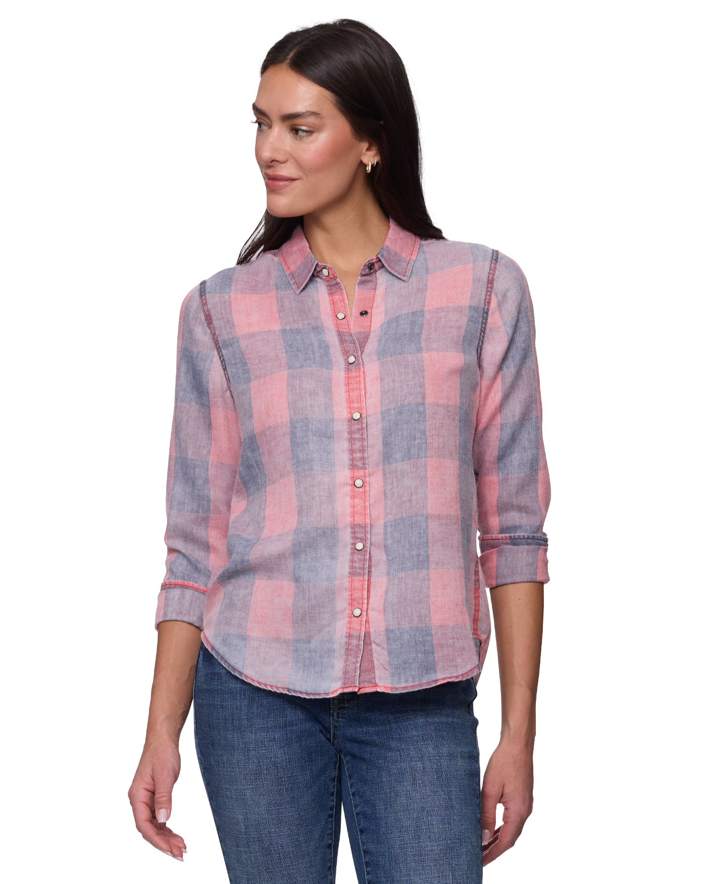 The perfect versatile piece to add to your fall wardrobe. Made from an insanely soft and comfortable cotton blend burnout fabric detailed with a timeless plaid print, this long-sleeve snap-front shirt offers an authentic, vintage-inspired look that’s impeccably tailored and fit to flatter you. Contrast fabric inside neckband, back yoke, sleeve cuffs, and plackets. Rounded hem.
