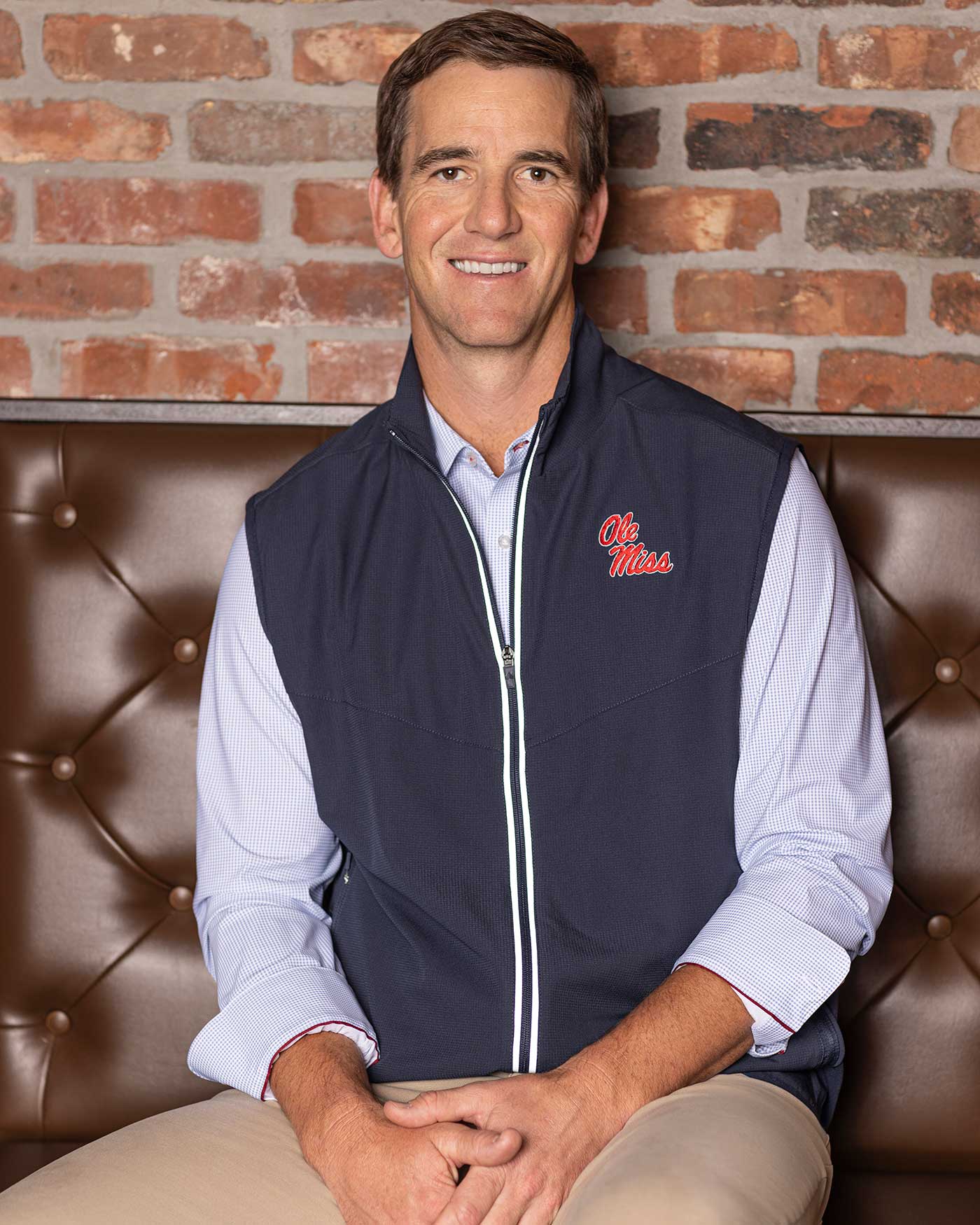 Venture out but stay comfortable in our MadeFlex Pivot Performance Vest. Versatile, lightweight, crisp in design, and made with smart details like the quick-drying finish and built-in UPF sun protection, it’s perfect for year-round wear. Its sleeveless design works well as a mid-layer under a jacket or slipped over a polo or shirt. Plus it has sleek zipper pockets along the side seam for keeping your hands warm (or your essentials close and secure). Funnel neck; zip through fastening. Ole Miss script lettering embroidered on chest.