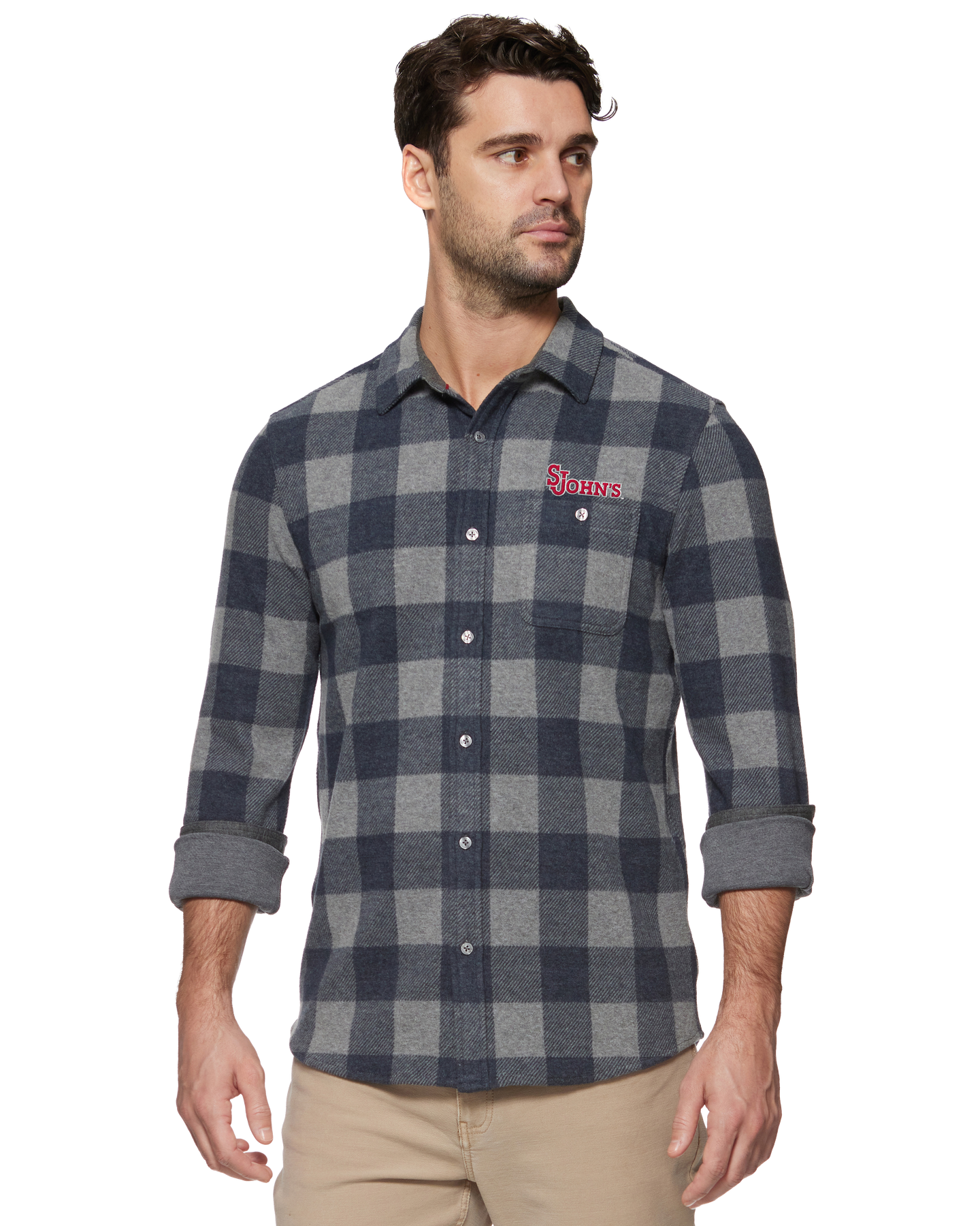 With a blend of extremely soft and stretchy knit performance fabric, you’ll find yourself reaching for this fall favorite all season long. Layer over your favorite tees, or on its own– this endlessly versatile flannel can be worn anytime, anywhere. Contrast fabric inside collar stand, back yoke, front placket, and sleeve cuffs. Dual front chest pockets; button closures. Tailored athletic fit. St John’s Red Storm wordmark logo embroidered on chest.