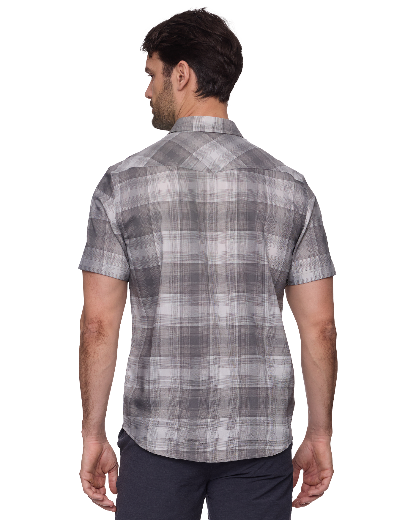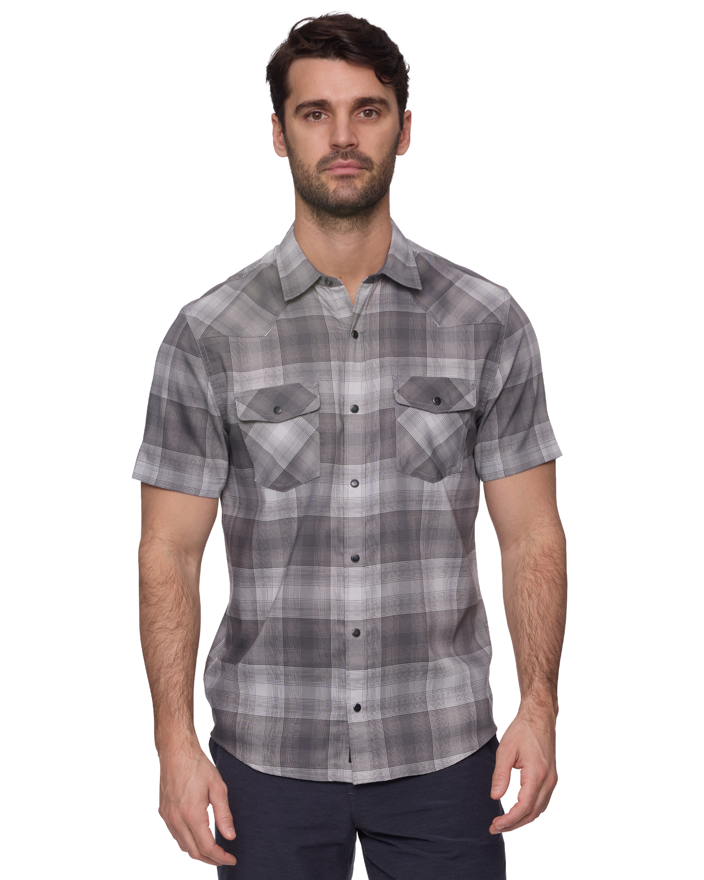 Made from a lightweight and breathable stretch fabric that wicks moisture, dries fast, and provides permanent UPF protection, this elevated short-sleeved Western shirt works hard to keep you comfortable and cool - even on the hottest days. Contrast fabric inside collar stand, back yoke, front placket, and sleeve cuffs. Dual front flap pockets; pearlized snap closures. Hidden lens cleaner at the hem keeps optics clean.
