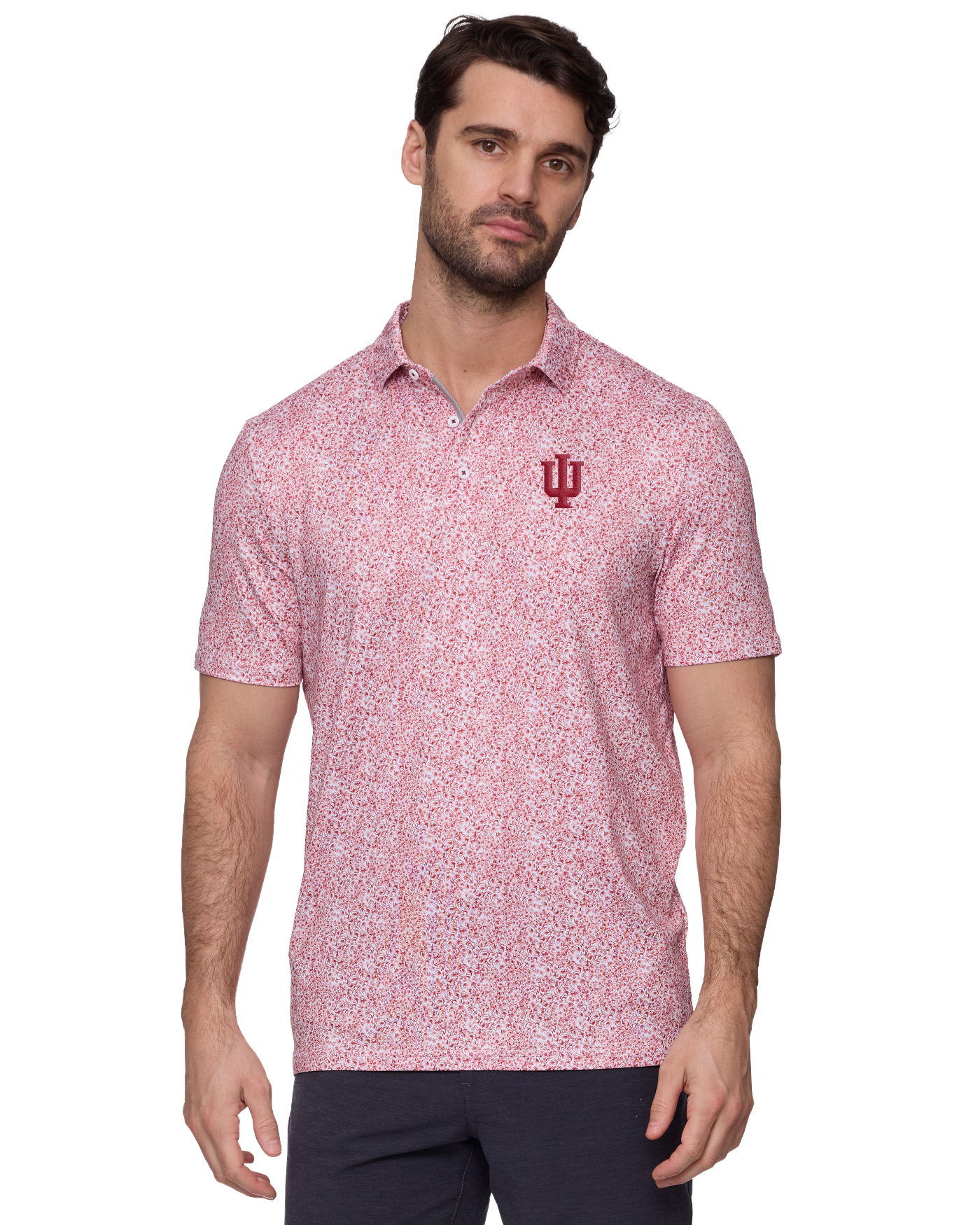 Made from a stretch jersey fabric that feels as smooth as your swing with details as sharp as your short game, we've teed up the most versatile performance polo in a variety of unique prints guaranteed to get the good times rolling whether you're on the go or in the game. Traditional three-button front placket; rubberized MadeFlex performance patch logo at center back neck. Indiana University IU trident embroidered on chest.