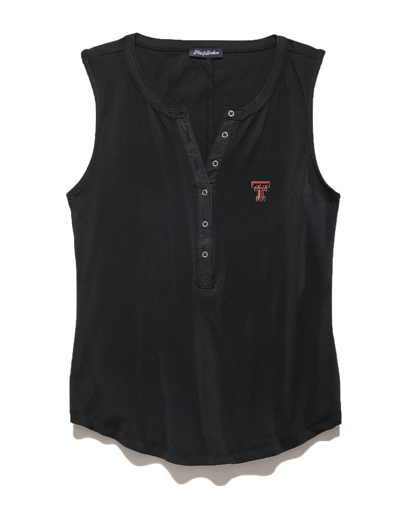 Comfy, casual, classic - our Denning Henley Tank is a must-have for creating a variety of cute gameday looks. Soft and stretchy ribbed knit shapes this essential top that features wide tank straps that frame a rounded crew neckline and a figure-skimming silhouette with a partial, henley-inspired button placket at the center. Texas Tech Double T embroidered on chest.