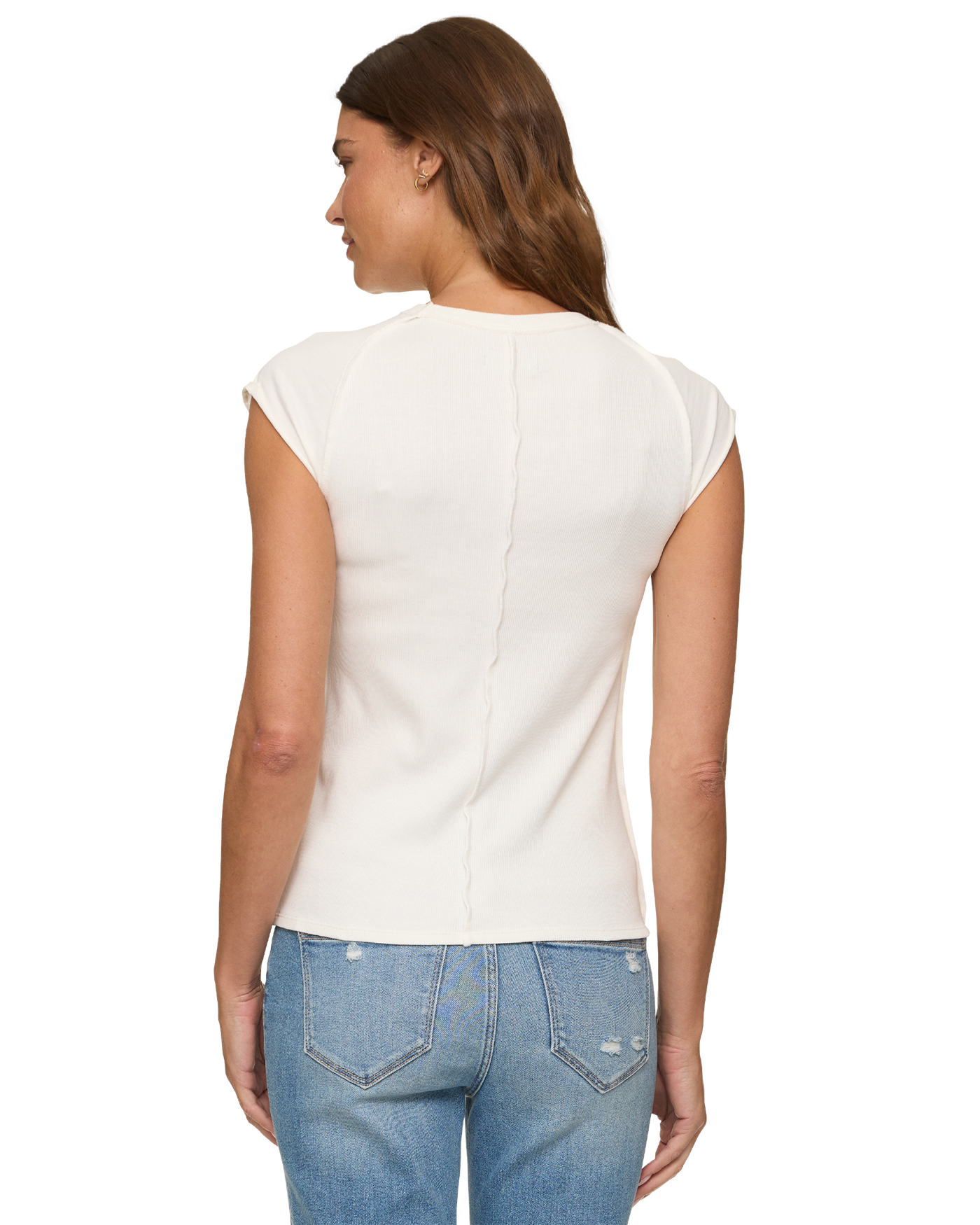Your new favorite anything-but-basic tee. Made from a super soft cotton blend fabric, with just the right amount of stretch, this timeless tee is a must-have wardrobe staple. The fitted silhouette stands out from the rest with its cap sleeves and raised seam detailing.