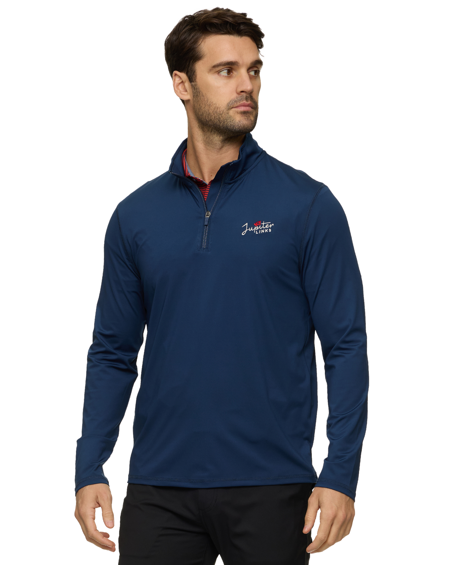 This iconic 1/4-zip delivers a performance-focused twist on the classic closet staple. Designed from super soft stretch performance fabric that wicks away moisture and shields you from the sun, our MadeFlex Journey Stretch 1/4-Zip pullover will keep you comfortable and dry, on and off the course. Standing mock neck collar; 1/4-length front zipper from chest to chin. Tailored athletic fit. Jupiter Links Golf Club logo embroidered on chest.