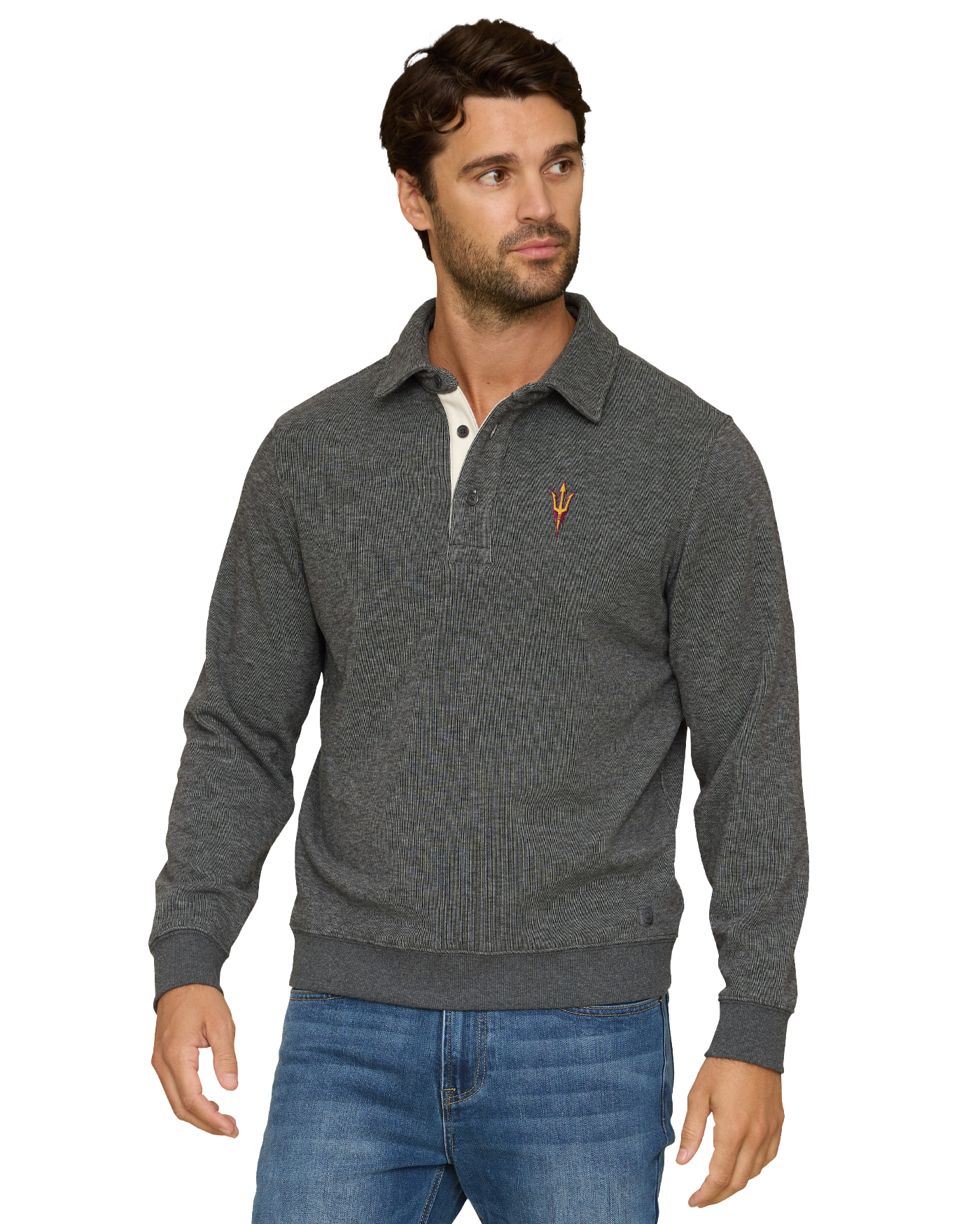 Our easy to wear Newton Henley Polo is perfect for looking pulled together without sacrificing comfort. The rugby-style collar adds a sporty, elevated touch to this fleece-lined sweatshirt. 1/4- contrasting button front placket; polo collar and back yoke. Tailored athletic fit. Arizona State University Sun Devils Pitchfork embroidered on chest.