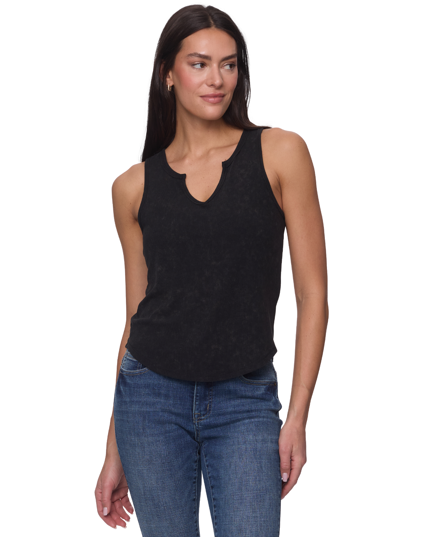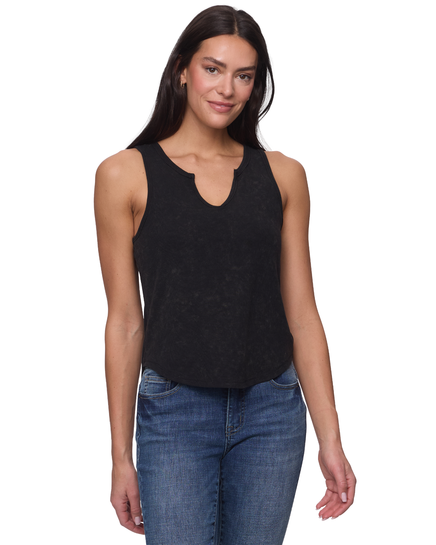 Our Anna Tank is a must-have for creating a variety of cute warm-weather looks. Soft and stretchy ribbed knit shapes this essential top that features wide tank straps that frame a notch front neckline– adding a flirty twist on a classic style.