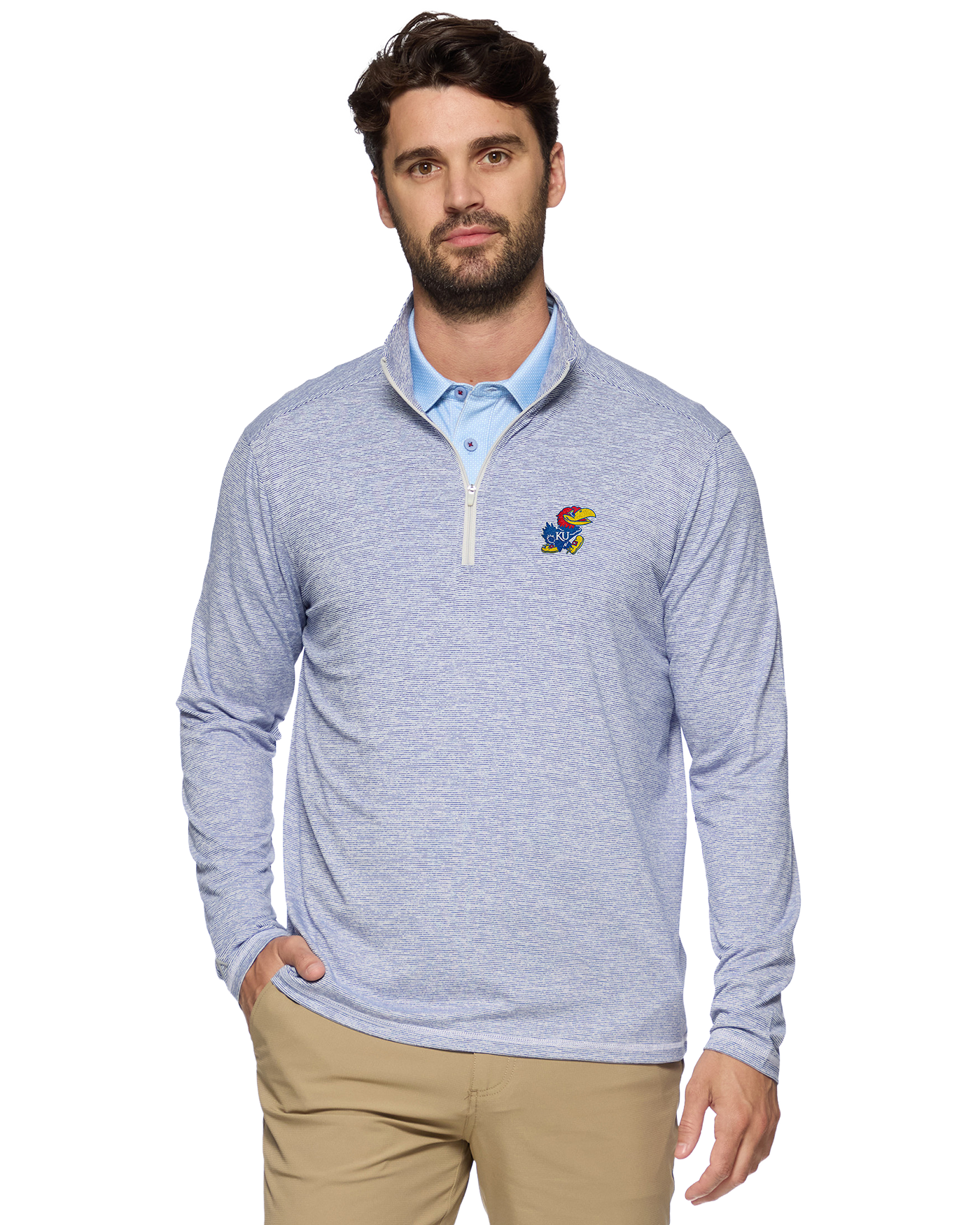 Comfortable, versatile, and made to move. Our MadeFlex Johnston Performance 1/4-Zip pullover is designed with extra stretch for peak mobility for the guy looking for a full range of motion on or off the course. Made from a sweat-wicking, sun-blocking, premium performance, space-dyed fabric, it’s the ideal layering piece for midweight warmth. Standing mock neck collar; 1/4-length zipper from chest to chin. KU Jayhawk embroidered on chest.