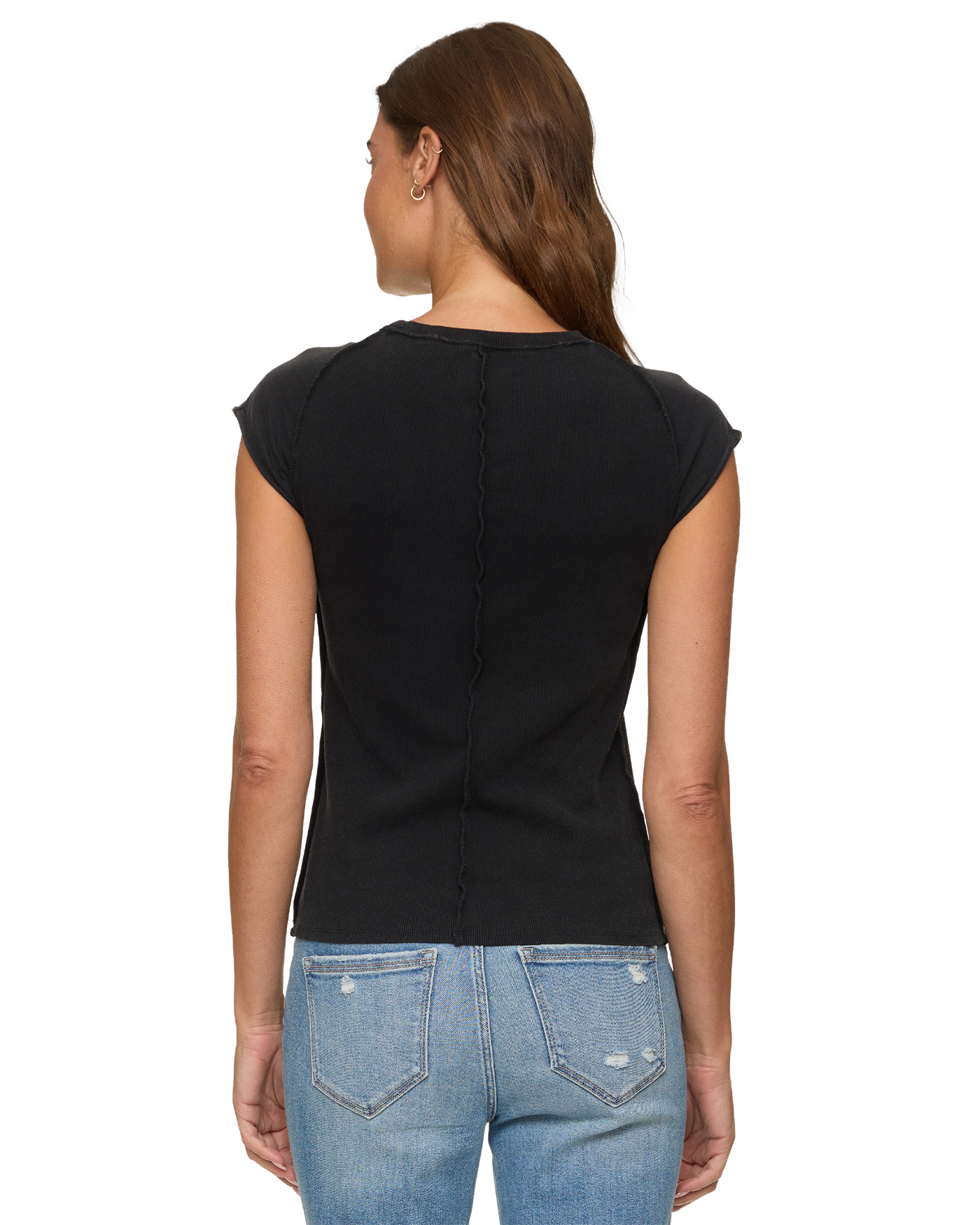 Your new favorite anything-but-basic tee. Made from a super soft cotton blend fabric, with just the right amount of stretch, this timeless tee is a must-have wardrobe staple. The fitted silhouette stands out from the rest with its cap sleeves and raised seam detailing.