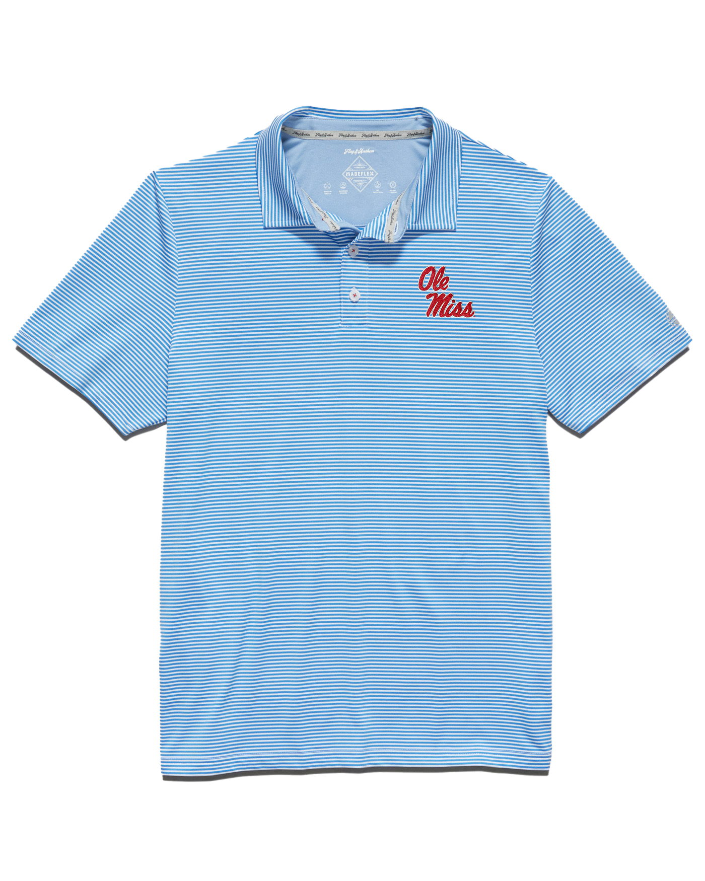 An innovative performance polo designed to look sharp, feel comfortable, and effortlessly transition from a morning on the water to an afternoon on the course and then out to dinner and drinks afterward. Featuring some of our best performance technologies to wick away moisture, maximize mobility, and shield you from the sun plus a versatile heathered look with micro-feeder stripes, this polo will quickly become your go-to. Traditional three-button front placket; rubberized MadeFlex performance patch logo at center back neck. Tailored athletic fit. Ole Miss script lettering embroidered on chest.