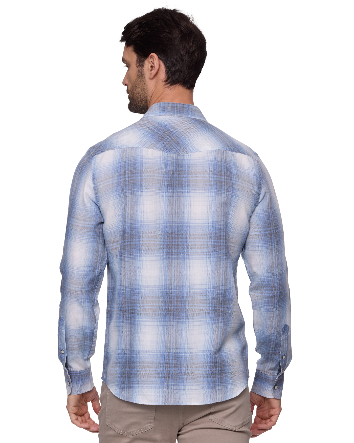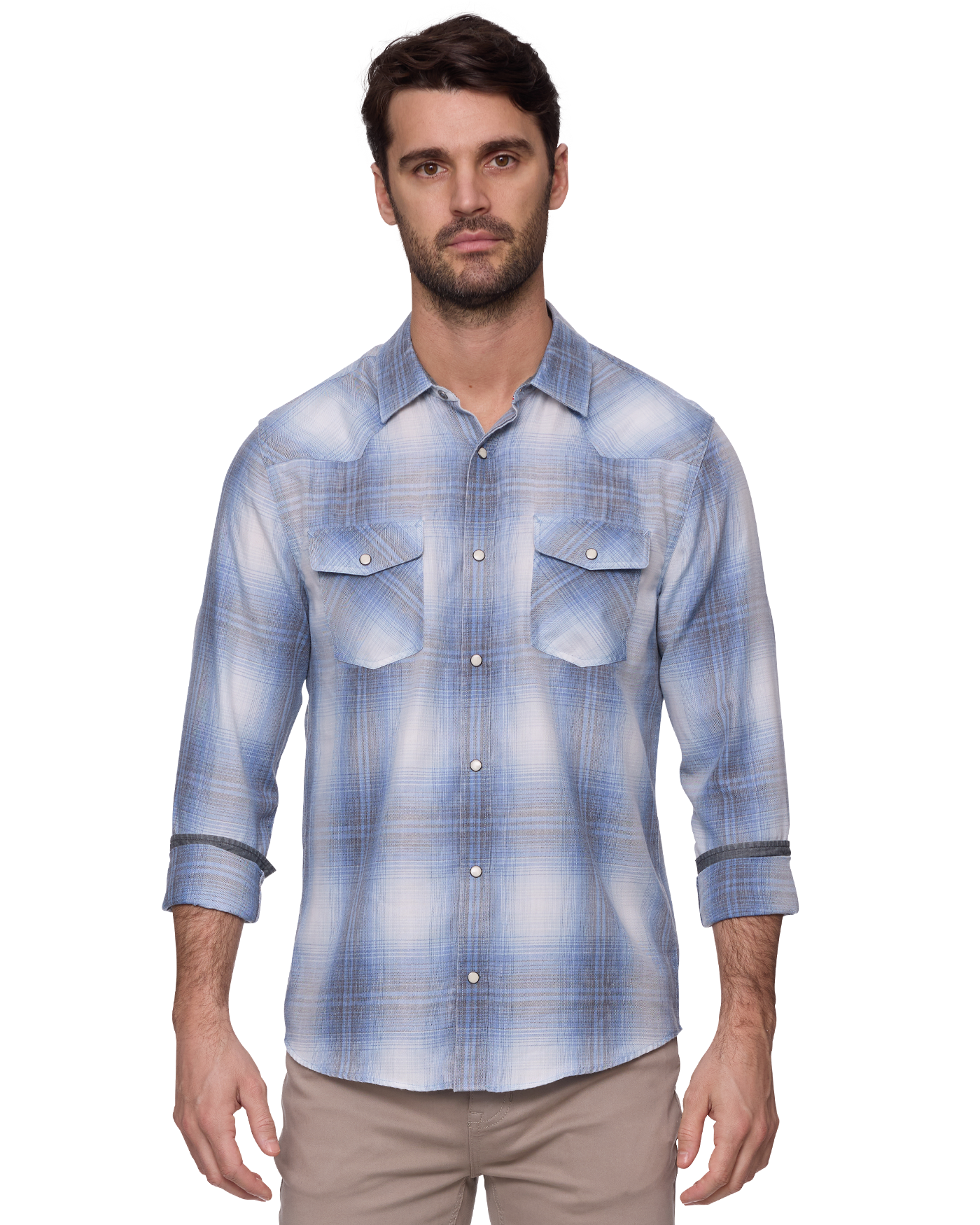 This lightweight button down will follow you through the seasons and with its burnout fabric features, it’ll become softer with every wash. Western yoke, dual front chest pockets; pearl snap closures. Contrast fabric inside collar stand, back yoke, front placket, and sleeve cuffs. Tailored athletic fit.