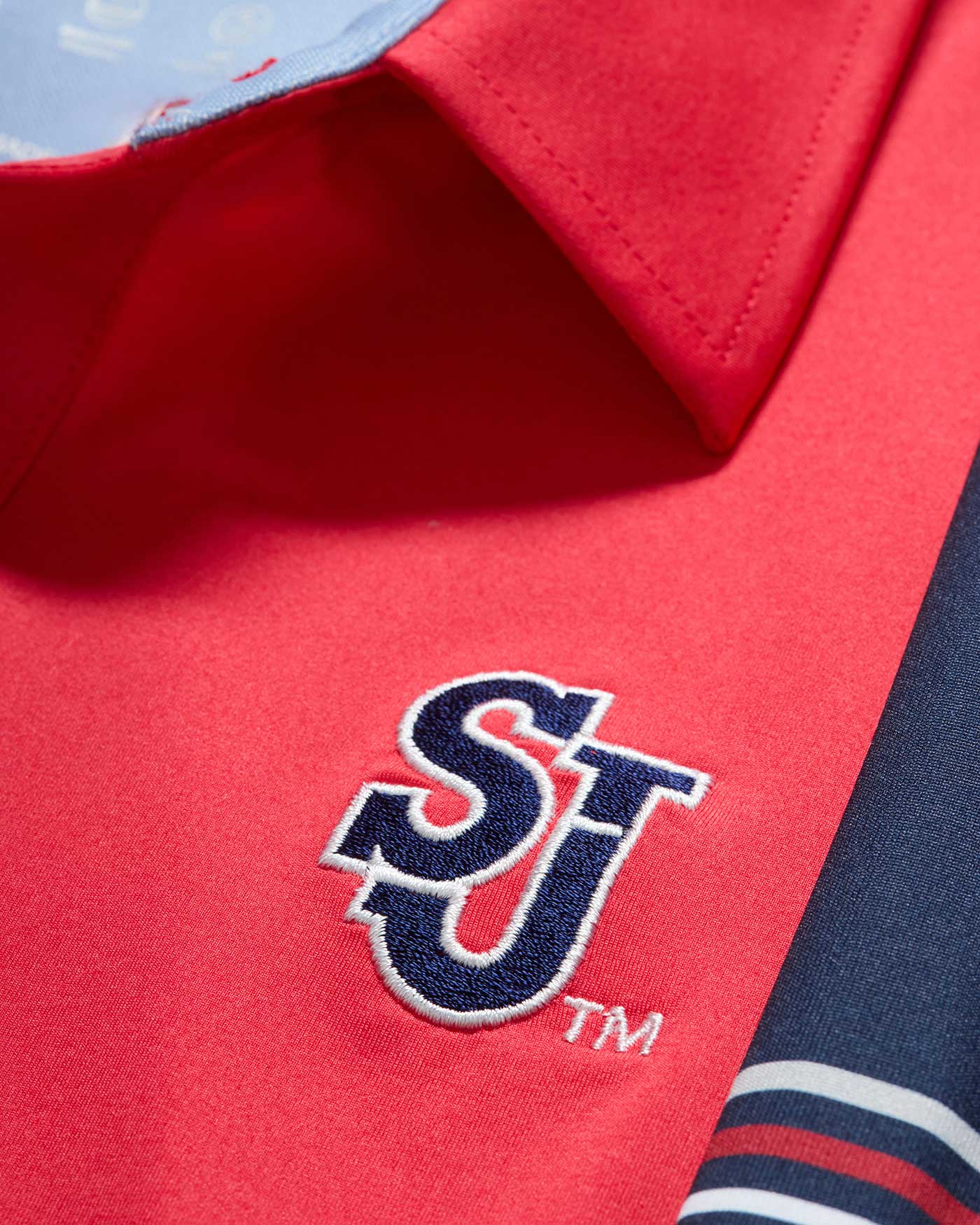 Made from a stretch jersey fabric that feels as smooth as your swing with details as sharp as your short game, we've teed up the most versatile performance polo guaranteed to get the good times rolling whether you're on the go or in the game. Traditional three-button front placket; rubberized MadeFlex performance patch logo at center back neck. Tailored athletic fit. St John’s Red Storm logo embroidered on chest.