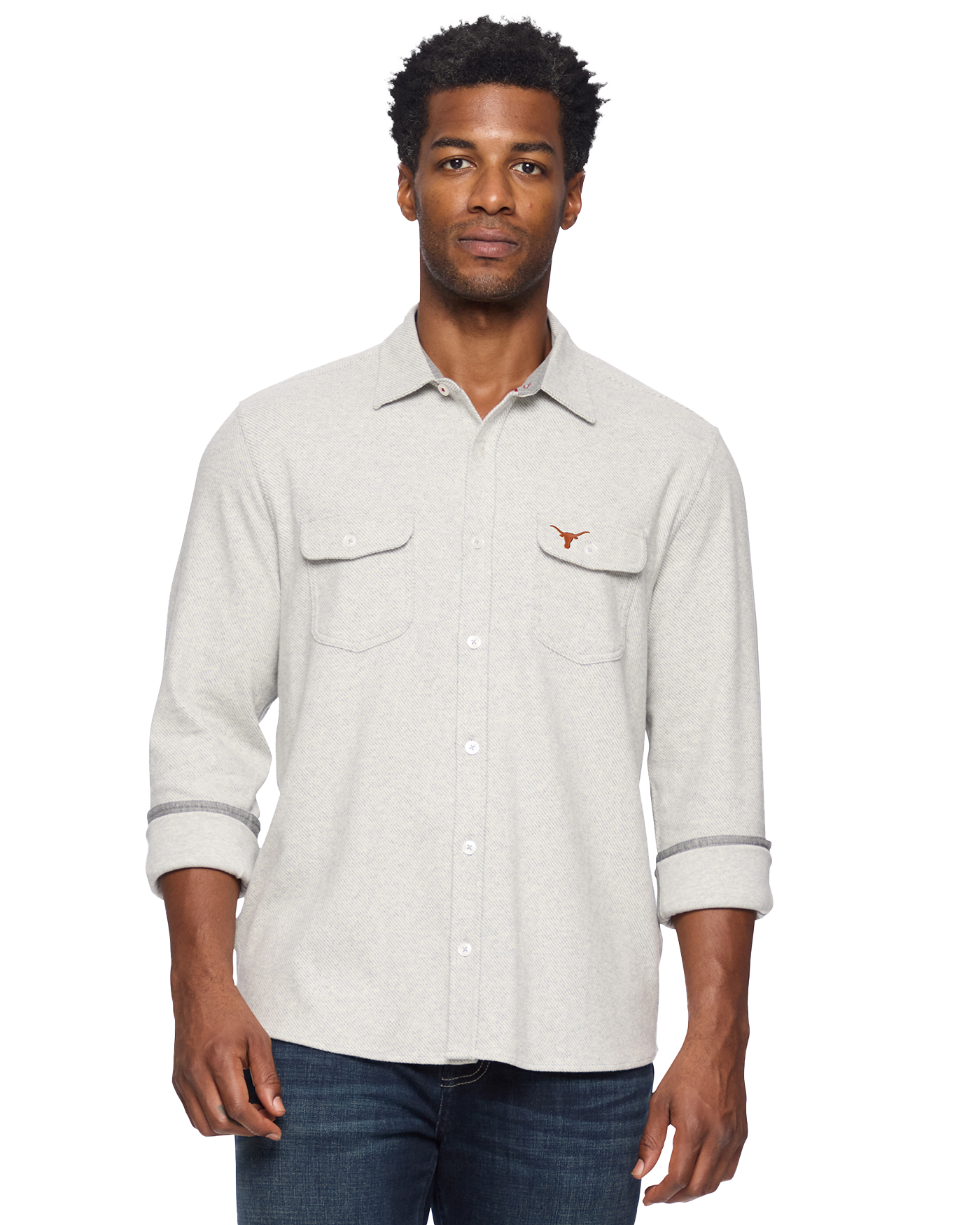 With a blend of extremely soft and stretchy knit performance fabric, you’ll find yourself reaching for this fall favorite all season long. Layer over your favorite tees, or on its own– this endlessly versatile flannel can be worn anytime, anywhere. Contrast fabric inside collar stand, back yoke, front placket, and sleeve cuffs. Dual front chest pockets; button closures. Tailored athletic fit. University of Texas Longhorns embroidery on chest pocket flap.