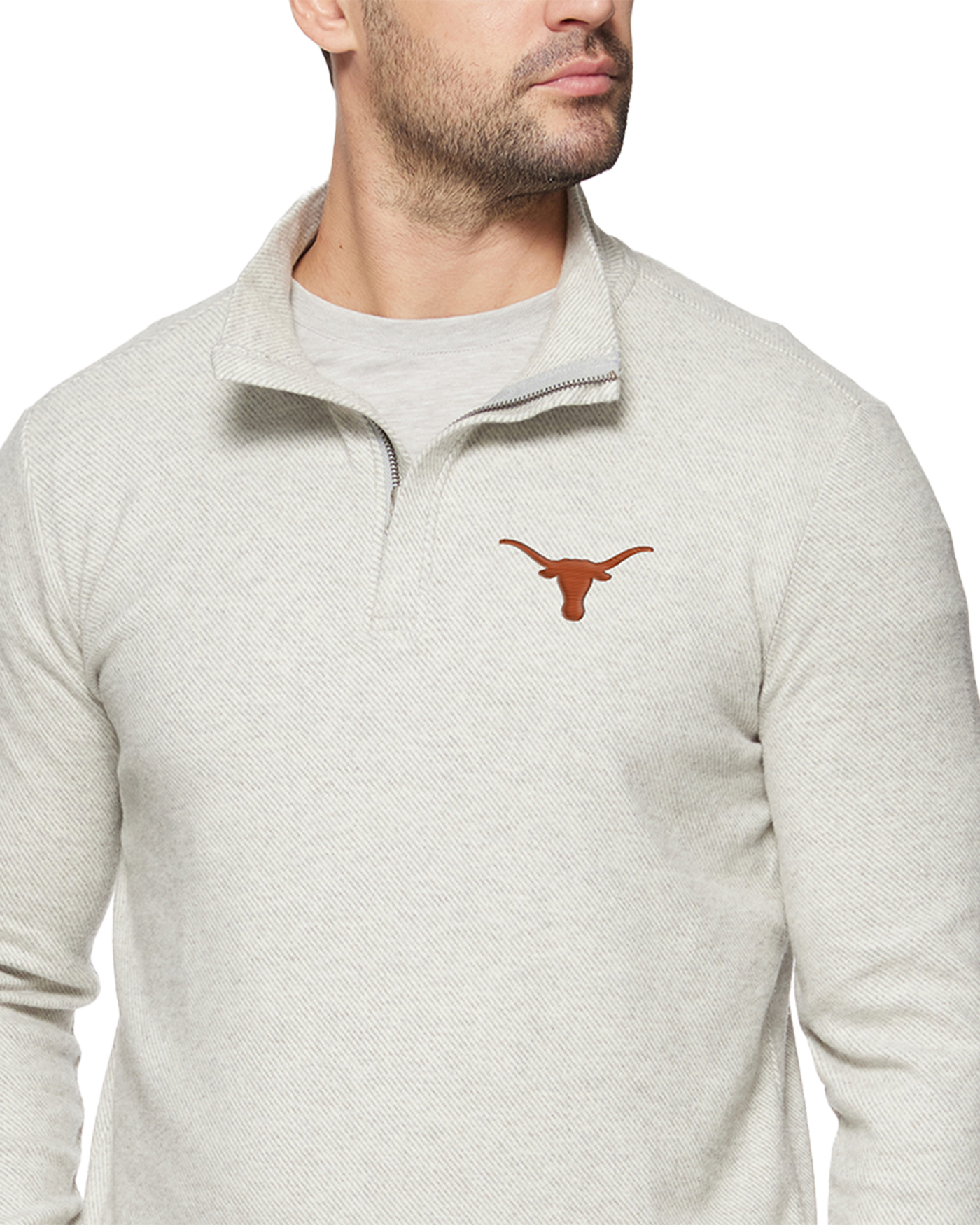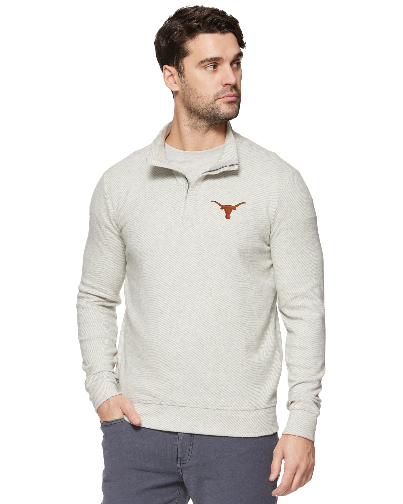 Crafted from a warm, mid-weight cotton blend fabric with a hint of stretch for easy movement and a naturally soft and breathable feel, this timeless pullover features an elevated heathered twill pattern for the perfect blend of rugged and refined. Standing mock neck collar; 1/4-length front zipper from chest to chin. Tailored athletic fit. University of Texas Longhorns embroidery on chest.