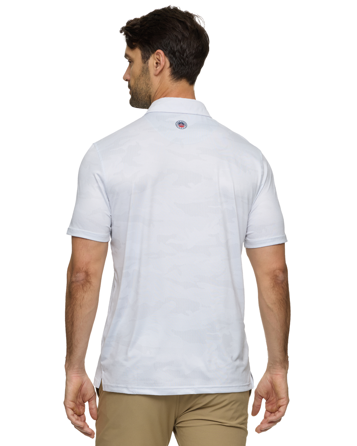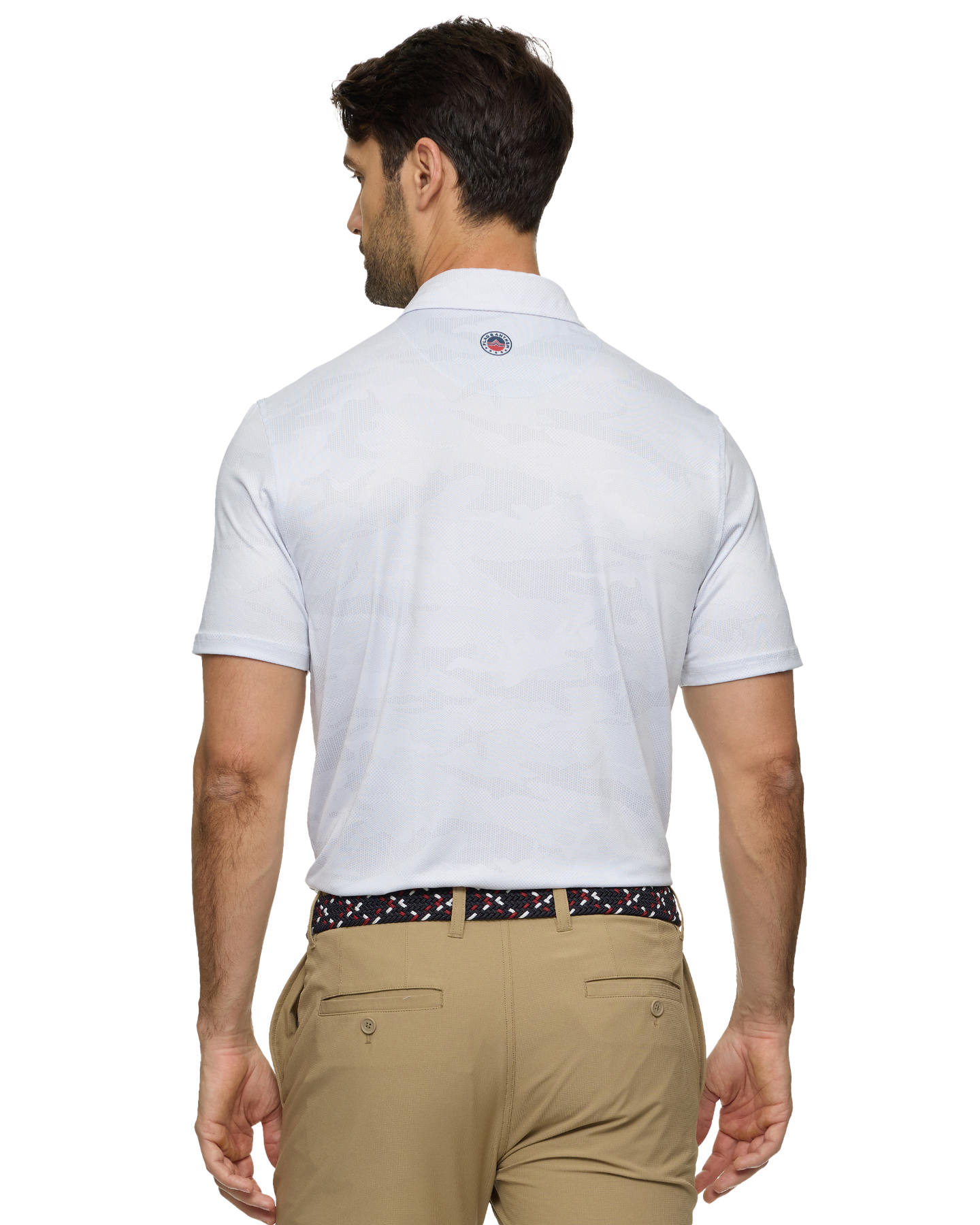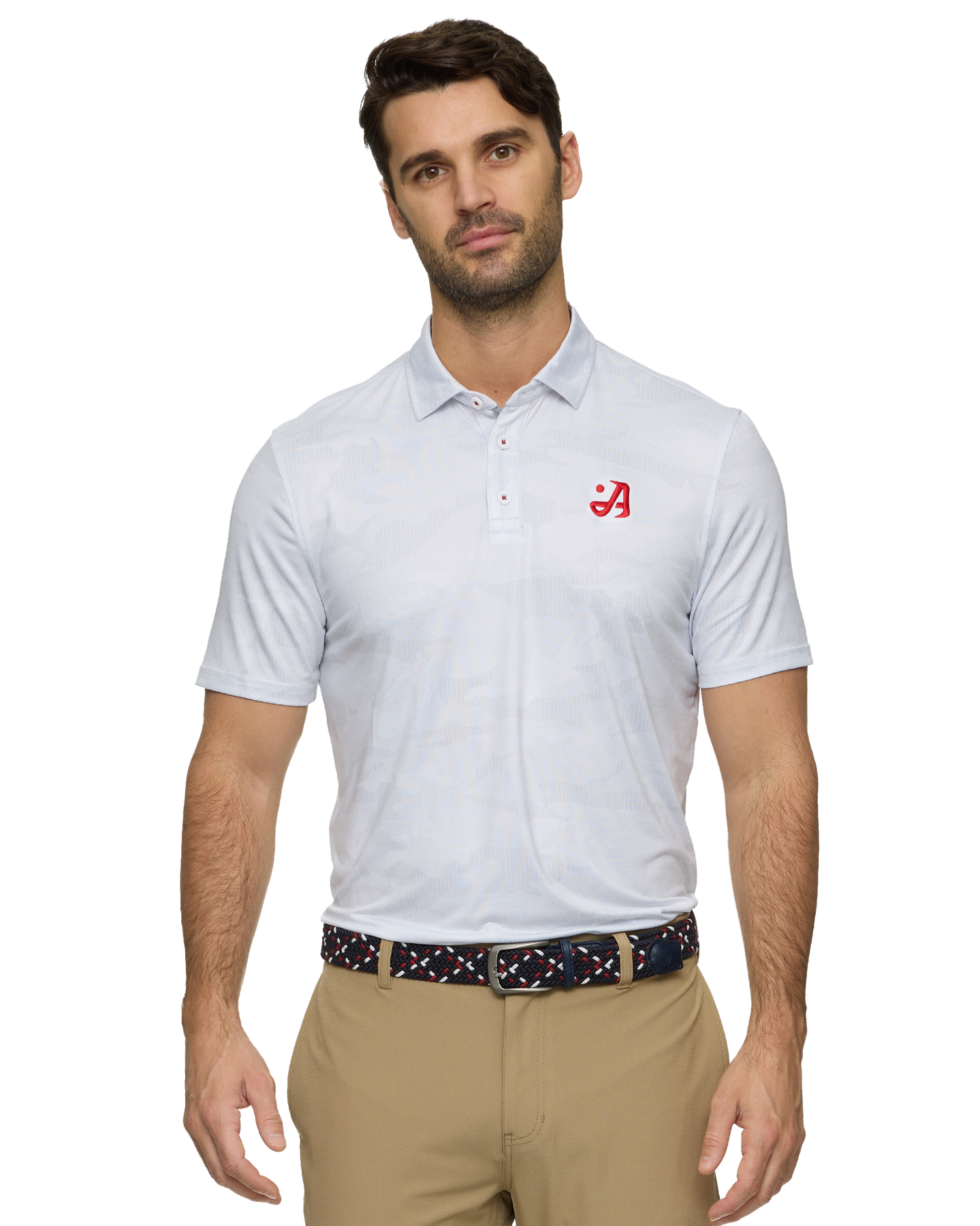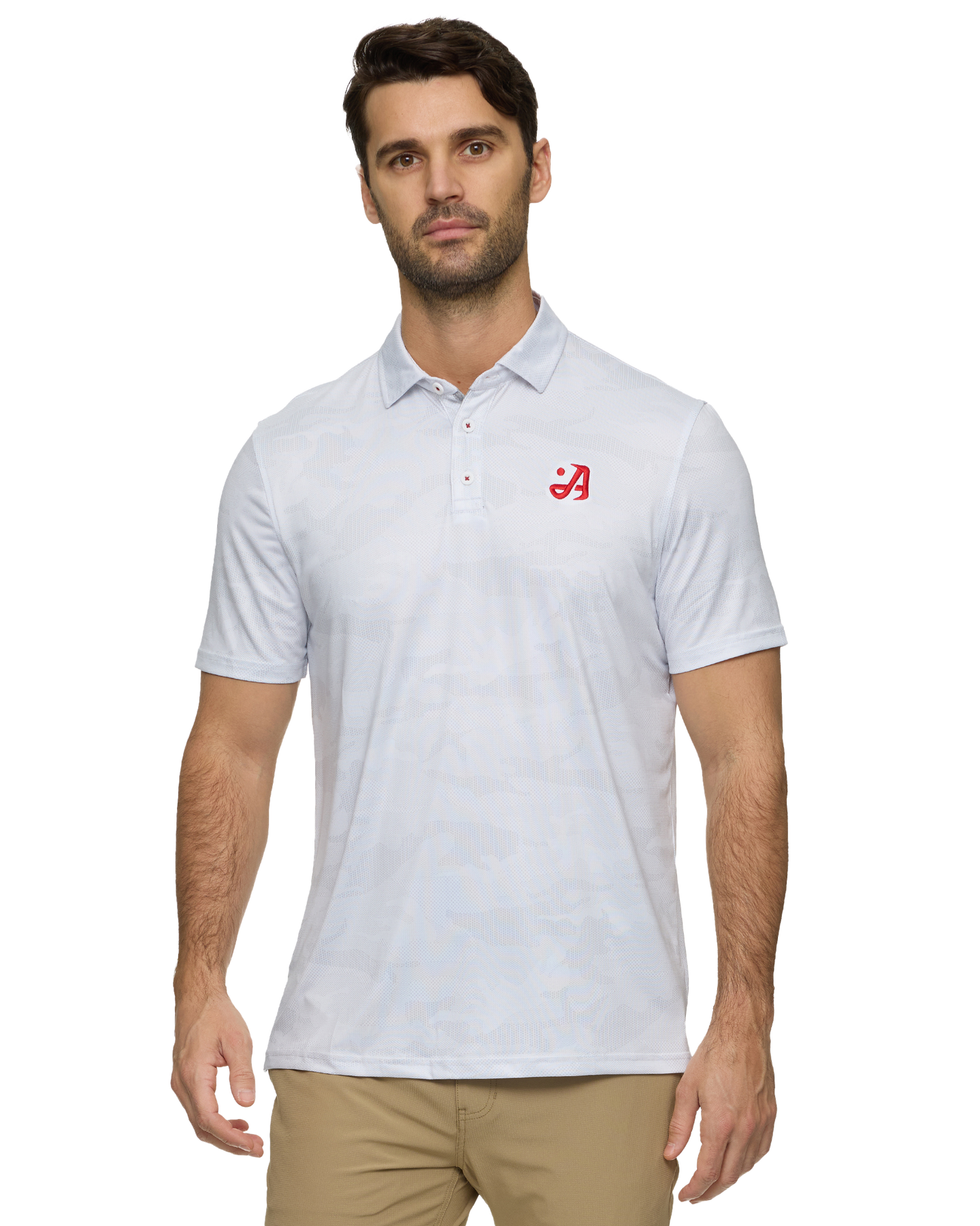 Made for the links. Ready for anything. This camo print polo packs all the performance punch for your favorite golf polo into a versatile style that you can wear anywhere. Made from a lightweight and breathable jersey fabric that delivers moisture-wicking technology, UPF sun protection, and easy care benefits plus four-way stretch for optimal mobility during your next round. Traditional three-button front placket; rubberized MadeFlex performance patch logo at center back neck. Atlanta Drive GC ‘A’ logo embroidered on chest.