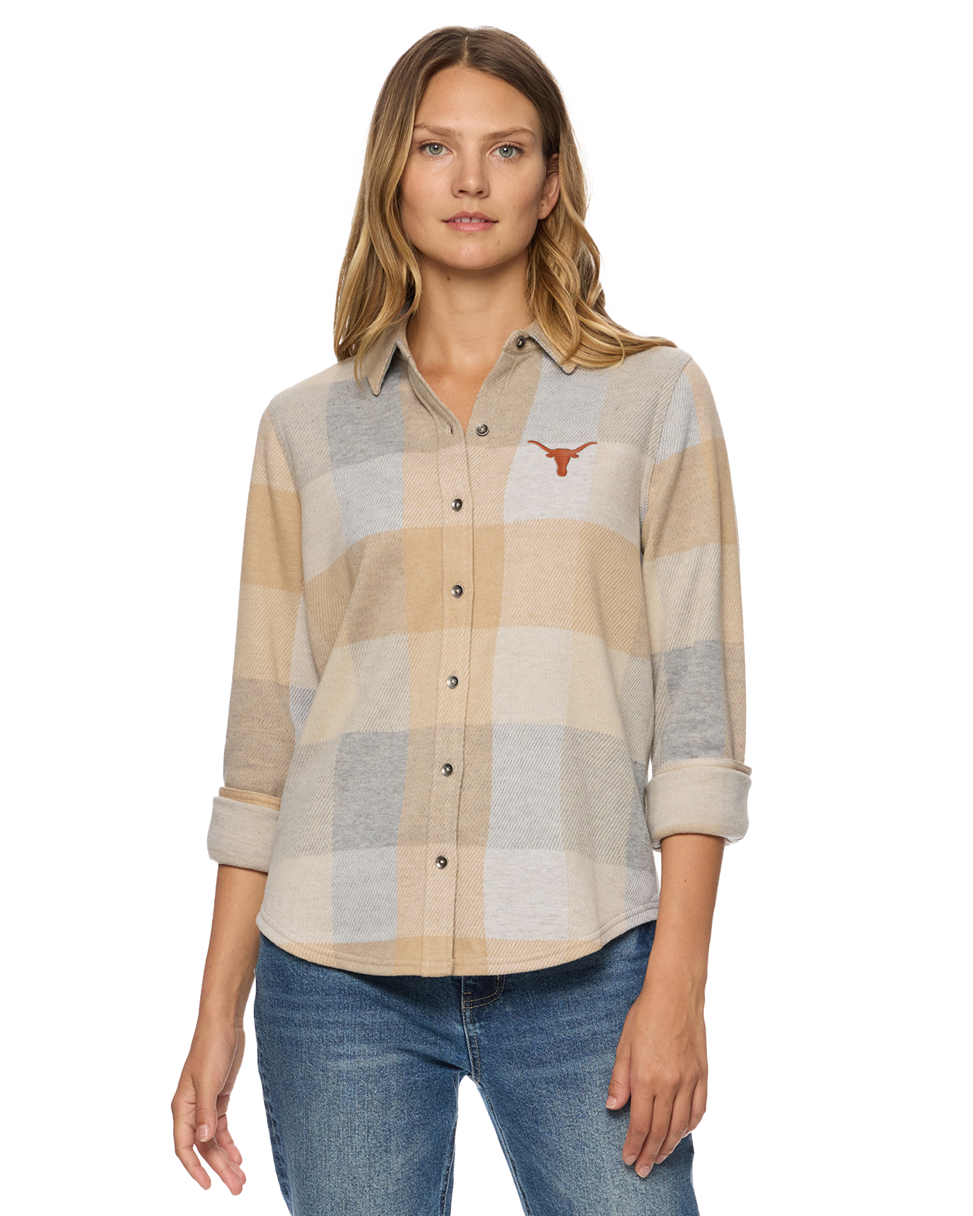 Ultra-soft and stretchy knit fabric transforms this basic button-down into a cozy favorite. With a timeless plaid print, classic collared neckline and full button placket. Wear with your favorite jeans and boots for the perfect fall gameday outfit. University of Texas Longhorns embroidery on chest.